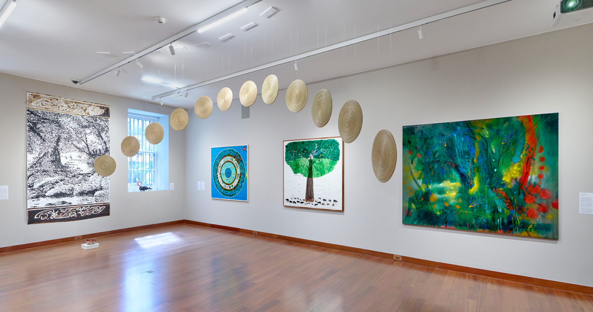 Amazonia Açu, installation view. Courtesy Art at Americas Society. Photo: Arturo Sanchez. Pictured, left wall and on plinth: Angélica Alomoto, Cuatro caminos (Four paths), 2024.