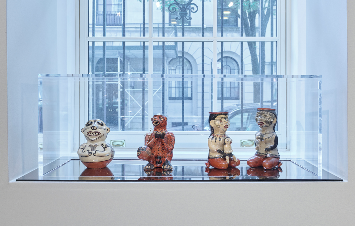 Amazonia Açu, installation view. Courtesy Art at Americas Society. Photo: Arturo Sanchez. Pictured, far left and second from left: Estela Dagua, Effigy (Supai), 1992–2004. Second from right and far right: Nancy Santi, Allpamama, 2025.