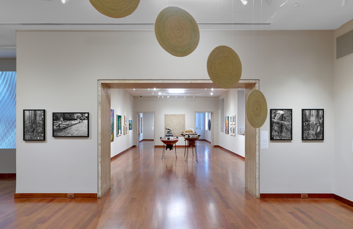 This vast assortment of practices foregrounds the idea that Amazonia is not simply a geographic region that can easily be delineated on a map. It lives in many localities—as much in the expansive environs of the river and its many tributaries in the “provinces” of these nation-states and territories as it does in migrant communities far beyond, such as those established in large metropolises, like Cantagallo, the self-constructed Shipibo community in Lima. (The absence of Cantagallo’s dynamic artists here is an omission; and it’s worth noting that the entire Peruvian “representation” is comprised of works from just one private collection, Hochschild Correa.) Amazonia and attendant Amazonian imaginary also spill into the “Western” former colonial powers, such as France or the Netherlands, where people with roots in the physical region have chosen to settle and work.