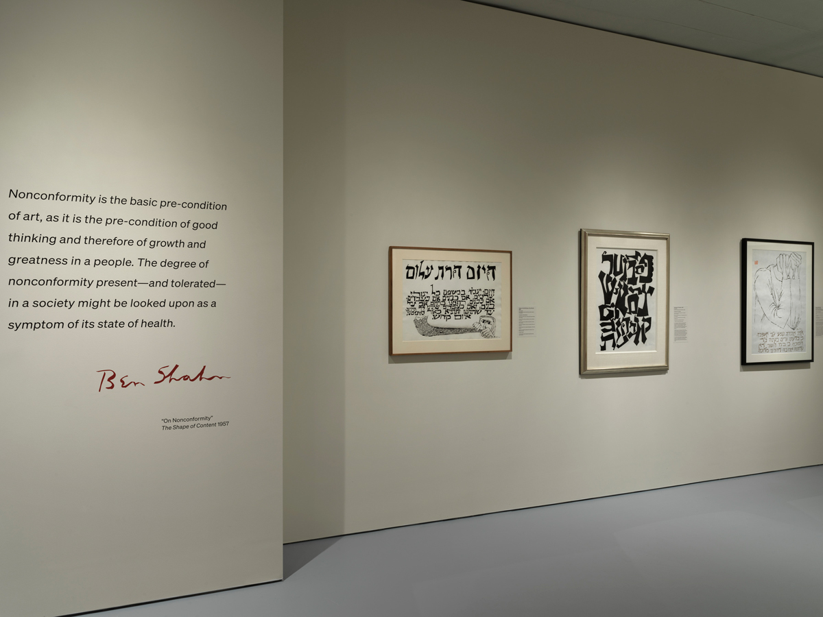 Ben Shahn, On Nonconformity, installation view. Courtesy the Jewish Museum. Photo: Dario Lasagni. Pictured, second from far right: Alphabet of Creation, 1957.