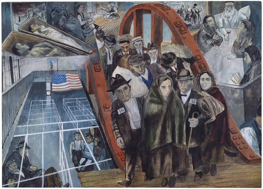 Consider Study for Jersey Homesteads mural (ca. 1936), which presents European Jewish immigration to the United States as a secular, modern-day exodus. Jersey Homesteads was a cooperative town intended to house Jewish garment workers, relocating from New York sweatshops and tenements. Somber immigrants flee anti-Semitic conditions in Europe for an unknown American future. The Statue of Liberty appears in the distance. Jews pray in Jerusalem, another refuge for them outside Europe, but New York City is the primary destination. Shahn merged the first wave of Eastern European immigration to the US (1880s–early 1900s) with Nazi-era emigration from Germany.