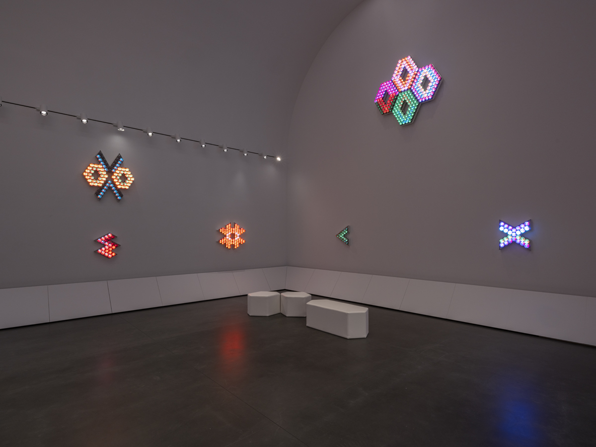 A Tom Lloyd retrospective on the third floor is a gratifying throwback to the Studio Museum’s origins—the artist and founding member of the Arts Workers’ Coalition was the subject of its first-ever exhibition, Electronic Refractions II, in 1968. In the vaulted gallery, the geometric arrays of colored lightbulbs, precisely timed to illuminate according to certain patterns and rhythms, couldn’t feel more contemporary. But this throwback is a telling moment of revisionism, too: the exhibition glosses over the conflicts that subtended the Studio Museum’s founding. Its decision back in the day to present Lloyd’s light sculptures was strategic: they couldn’t have been further from the brashly political, socially engaged work advocated for by the Black Arts Movement, and were much more in line with what you might have seen at MoMA or the Whitney. This caused some controversy among Harlem residents—including artists and community activists—who were already suspicious of the new institution, in part because they understood many of its initial founders and funders to be downtown drop-ins (read: rich and white). At the opening, according to the artist Ed Spriggs (as recounted in Cahan’s Mounting Frustration: The Art Museum in the Age of Black Power), a museumgoer smashed at least one of the pieces, shouting as he did, “This shit ain’t no Black art. This ain’t no Black museum.”