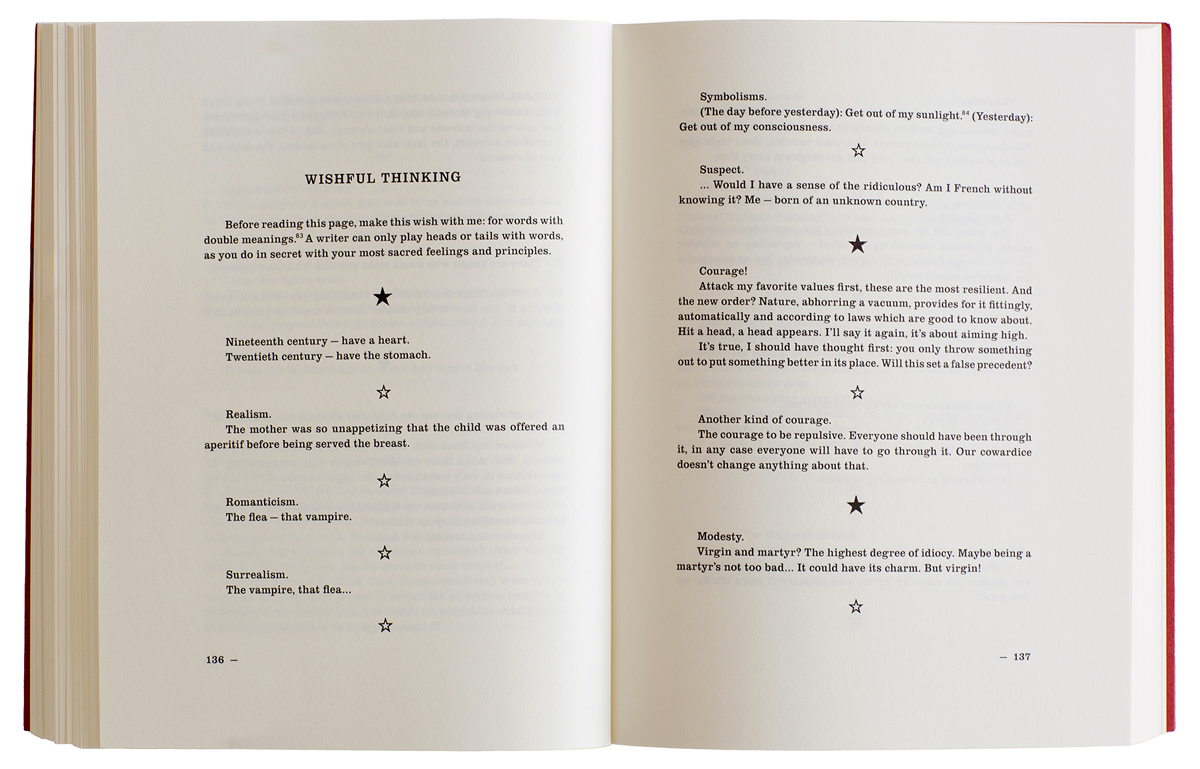 Form, Groom writes, is “all over the place” in Cancelled Confessions. True, the book moves with delirious energy from one mode to another—stories, essays, dialogues, portraits, spiritual or metaphysical disquisitions. There are shards of sense, almost sentences: “Fast and Good. Short but sweet. . . . Anxious dawn. . . . Guillotine window.” Aphorisms that seem to be spoken by Cahun, or from a variety of named and nameless avatars. “There are people who would make you sick with their ugliness.” “It’s infuriating that one can only offer what one has, what one is.” “The great question is not: Does it have a purpose?—but: Does it add anything?” You could put this last query to Cahun’s text itself, in lieu of looking for sense, and say: it adds (to their oeuvre, to experimental prose in the era of Surrealism, to the sabotage of gender) an extraordinary collection of images. There is the “imprisoned wasp which knocks at the walls of my breast.” The mirror as symbol of capture and release. And the book’s most comical conceit: “Human body. It should be stuck upside down in a vase so that it arranges itself elegantly, so that it blooms, so that it has four branches, four flowers and the bulb is hidden.”