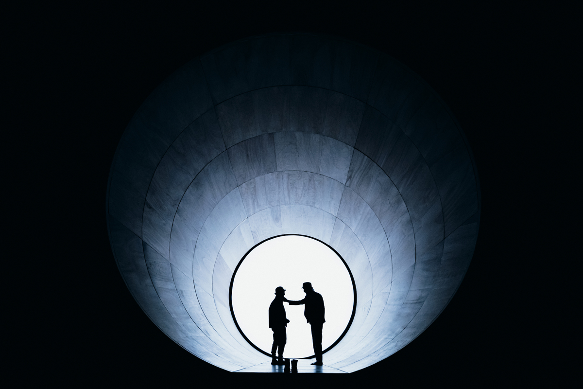 Designer Soutra Gilmour rips the seams even further, swapping Beckett’s country road for a stage-swallowing set piece that looks like something between a concrete pipe and a camera lens. It’s a striking sculptural work to be sure, and together with Jon Clark’s exquisite lighting produces some very chic stage pictures, but it condenses the playing space to such an absurd degree that rather than wrestling and imagining what to do with themselves as their characters wait and wait and wait, the actors largely just sit or stand in place. It doesn’t help matters that when the lights go down, we hear the sound of a camera click. Bless. Somewhere in this production it seems Lloyd has seeded a low-key meditation on theater versus film, or on acting versus celebrity. Although I can’t stoop to excavate it, I will say that hobbling an actor by pointing up the fact of their fame inspires little trust in a director’s intentions.