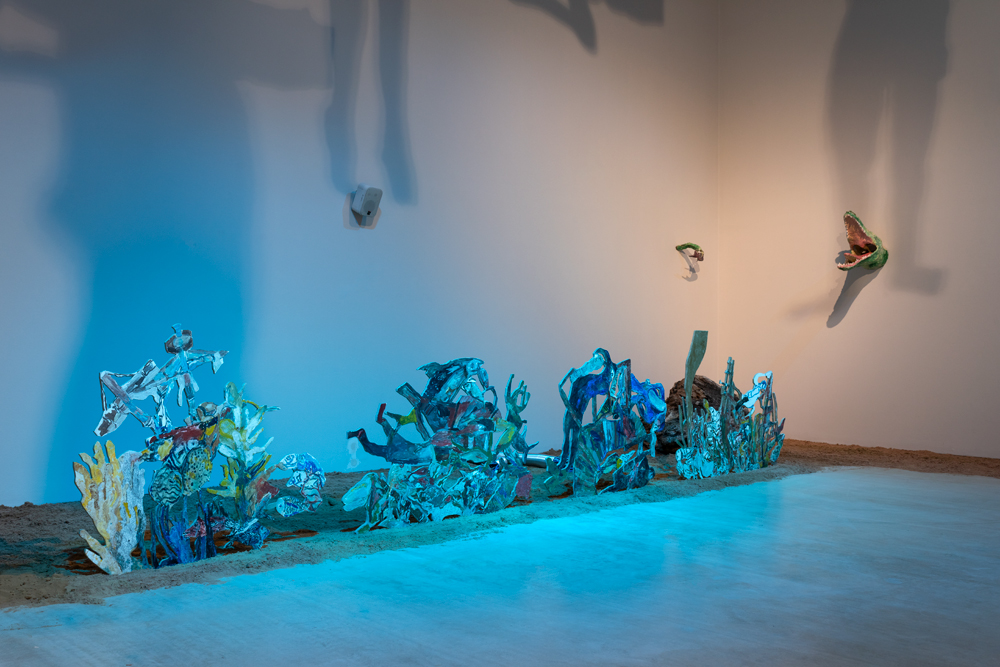 The exhibition ends with its eponymous work, created specifically for the context of Margate, defined by its long, curving seafront and its tide that seems to come so far in and head so far out: at certain times of day, you have to walk for what feels like miles to get wet past your knees. The large room is bathed in blue light and filled with sand, over which are scattered cutouts of marine life, swimmers, shipwrecks. The walls are alternately bare, cast with the shadows of hanging bodies, this time in swim shorts and snorkel gear, or painted, fantastically colored city- and landscapes. Where are we, I ask again? On land? At sea? An accompanying audio piece combines sound from Margate and Alexandria, Egypt, as if we could be in both at the same time, as if Boghiguian is our conduit between the two. At the edge of the sea, we become aware that another world is not only possible, it’s already here—we just can’t always see it.