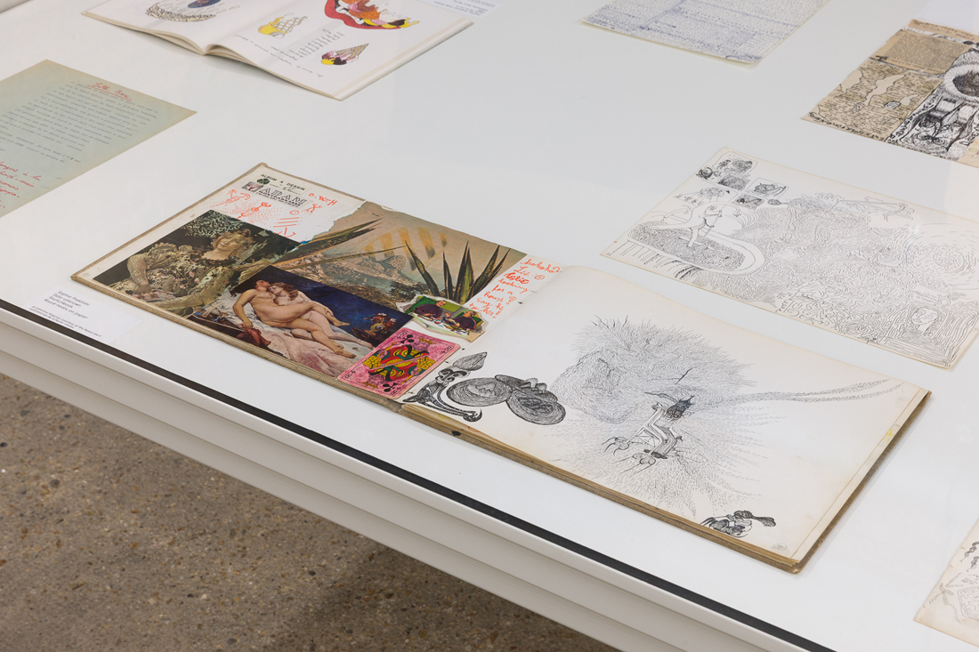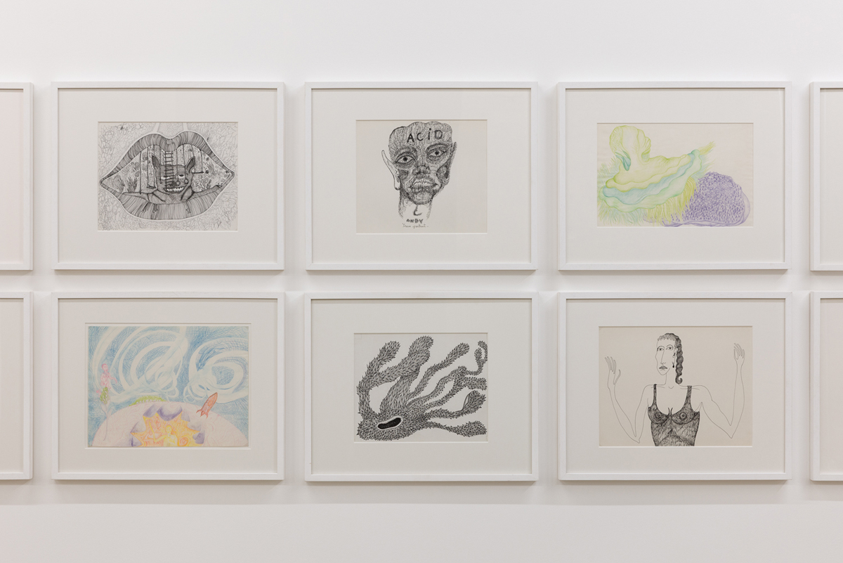Wisdom Should be Sung is the first UK solo exhibition of Podolski’s oeuvre, which encompasses drawings, etchings, collages, archival materials, and texts, including graphic poems and a novel, Le pay où tout est permis (1972). In the spirit of other countercultural movements of the time, Podolski and her fellow “freakies” (as the group called themselves, in opposition to “hippies”) made the house in Ixelles a kind of country of its own, in which they lived by their own rules and everything, really, was permitted. She joined Montfaucon at sixteen and was furiously productive until her death from injuries sustained during attempted suicide six years later. (Podolski was diagnosed with schizophrenia at eleven, and her illness worsened over time.) In the corner of the show, surrounded by the artist’s vast output of wild, extraordinary, utterly sui generis endeavors, Dans la maison plays on a loop, showing flashes of the rooms in which Podolski and her friends lived, experimented with drugs, made art, dreamed of finding ways to survive capitalism, war, violent governing structures, the tyranny of a coherent self.