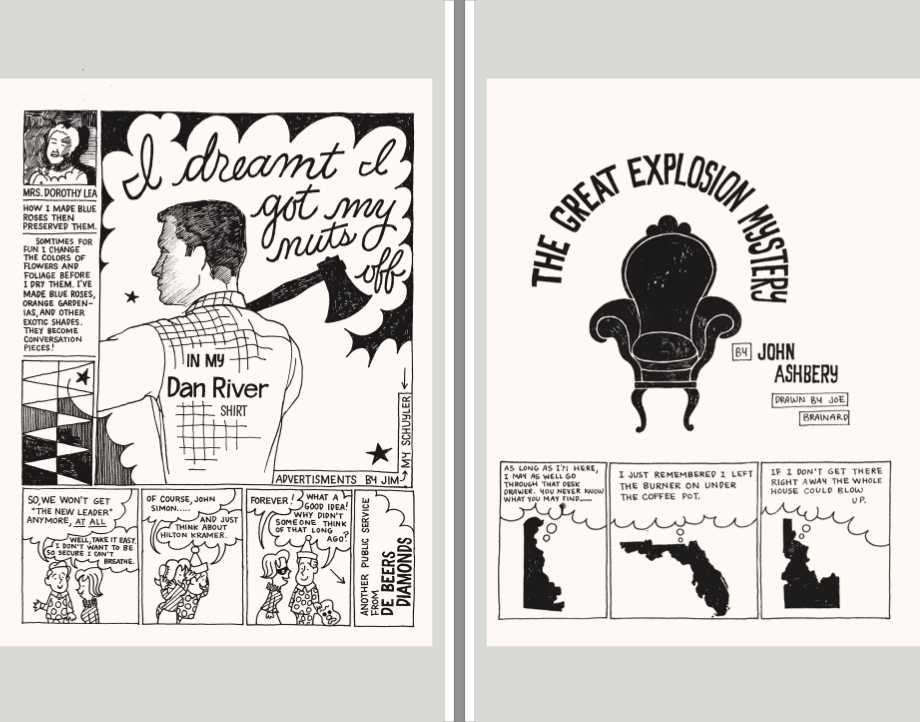 From The Complete C Comics, by Joe Brainard. Left: advertisement by James Schuyler. Right: “The Great Explosion Mystery” with text by John Ashbery.