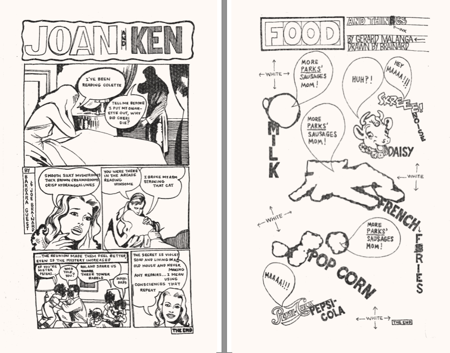 From The Complete C Comics, by Joe Brainard. Left: “Joan and Ken” with text by Barbara Guest. Right: “Food and Things” with text by Gerard Malanga.