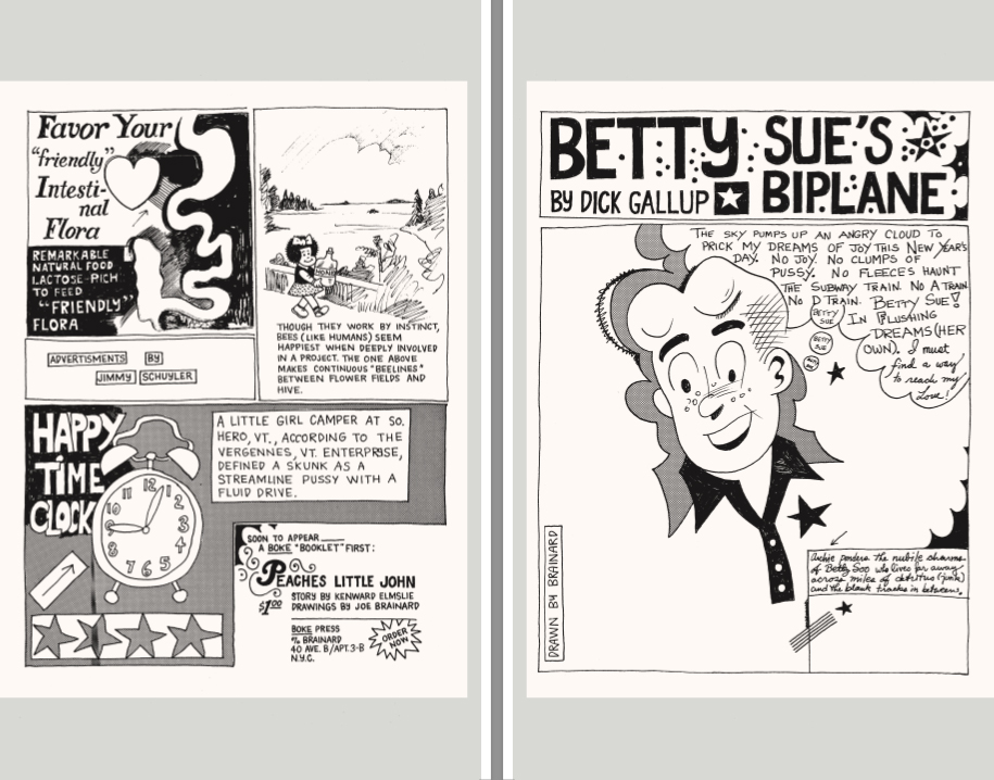 From The Complete C Comics, by Joe Brainard. Left: advertisements by James Schuyler. Right: “Betty Sue’s Biplane” with text by Dick Gallup.