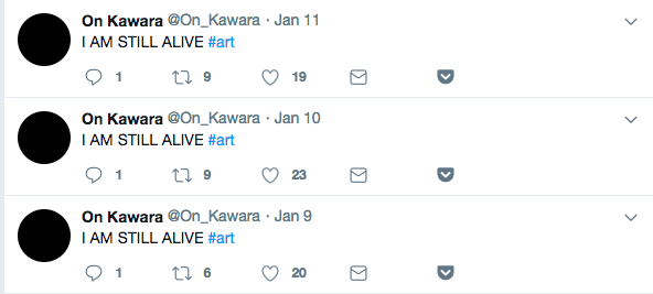Now that the artist is actually dead, the statement “I am still alive” doesn’t feel plaintive or reflective. Of course, curators and art historians have conferred upon Kawara something close to immortality. But @On_Kawara has given the man immediacy. I now see all of Kawara’s work as the product of a mind fretting over its eventual demise. So too do I see it as the product of a man who triumphed over that demise. He actually is still alive.