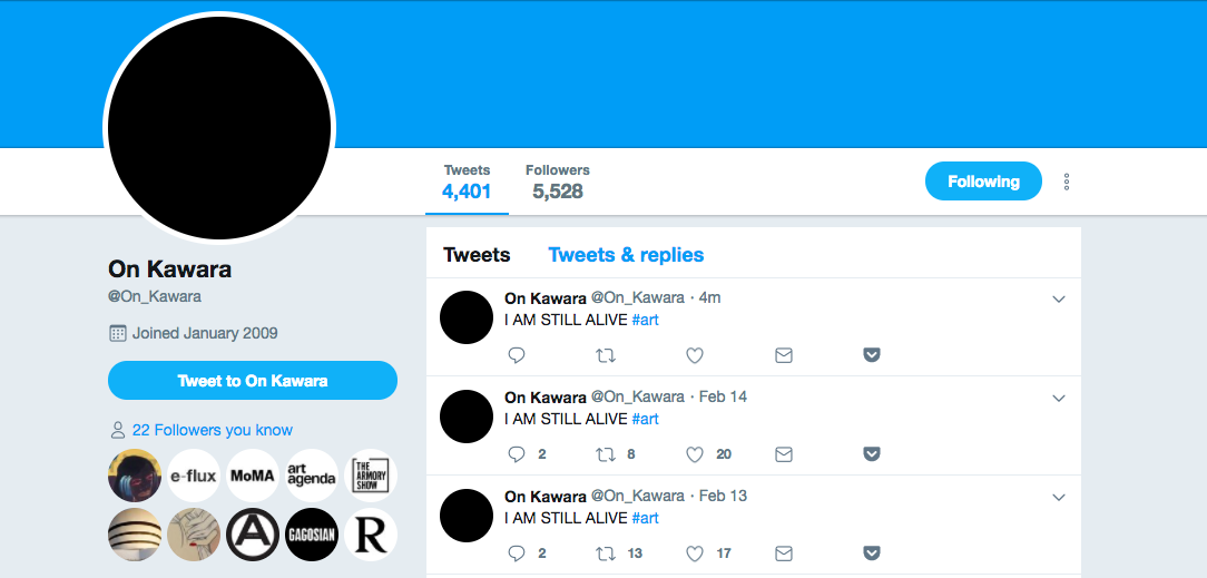 For the past four thousand–odd days, @On_Kawara has issued the same digital proclamation: “I AM STILL ALIVE.” Appended to this message is the statement #art. When you click on that #art, Twitter will deliver every statement so designated, and you see how broad a definition art really has.