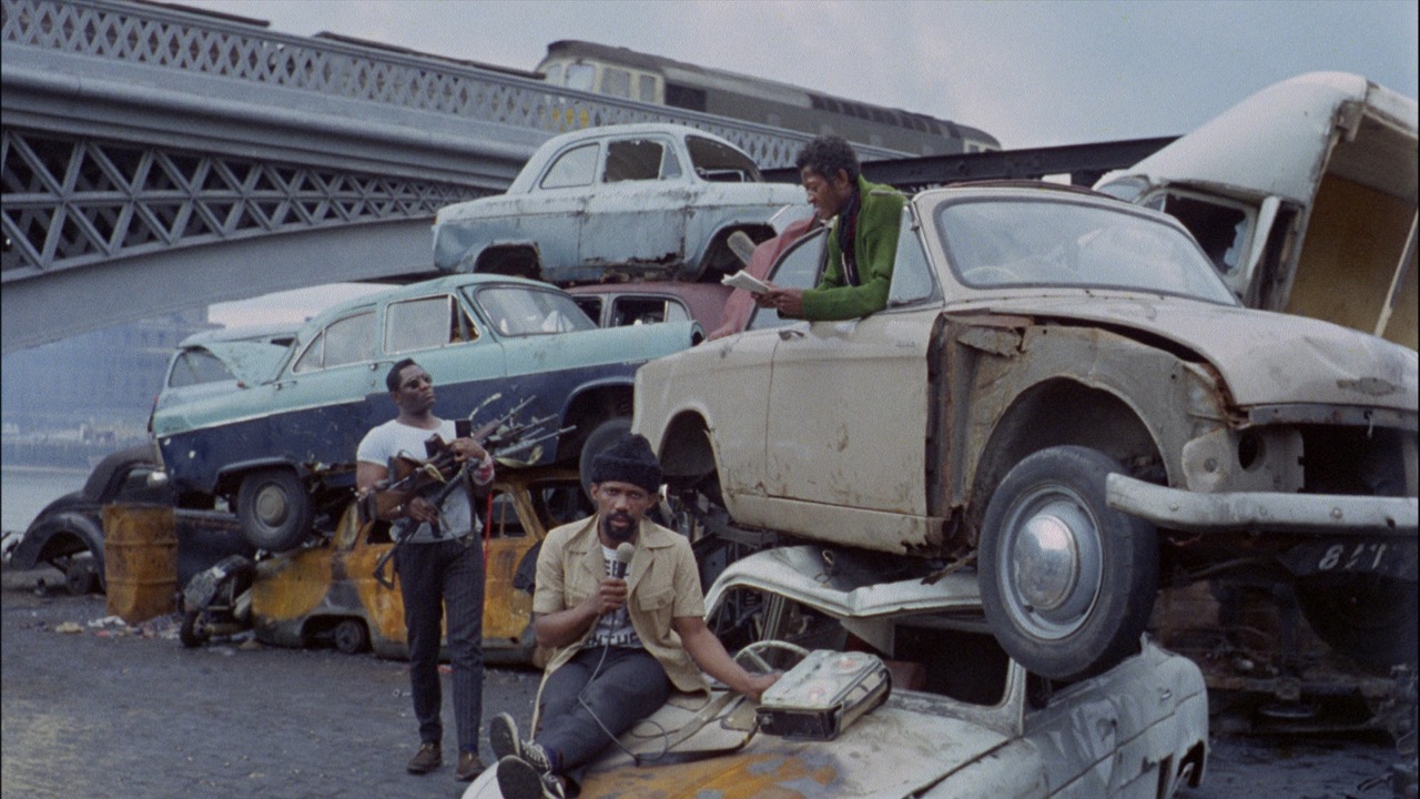 History in the present tense, the Stones’ sulfurous anthem has a gravity and political urgency missing from Godard’s film, despite its strenuous sloganeering. Interlaced with the patient, curious scenes in the Olympic Sound Studios are several agitprop skits, motifs of varying degrees of obtuseness. In one, an haut mod, clad all in purple, reads aloud from Mein Kampf in a smutty bookstore; the cramped space also holds two bloodied POWs who affectlessly proclaim, “Peace in Vietnam.” (The Nazi lector is played by Iain Quarrier, the producer who insisted on the name change of JLG’s movie; Godard returned the favor by punching Quarrier during the premiere of Sympathy for the Devil at the London Film Festival in November ’68.) In another thread, black revolutionaries assemble in an auto scrapyard by the Thames. Rifles are tossed from one man to the next; passages from Amiri Baraka and Eldridge Cleaver are recited. The segment is cacophonous and inert. Other sections return to Anne Wiazemsky, the twenty-one-year-old actress then married to Godard: as Eve Democracy, she is seen spray-painting feeble portmanteau mottos (“FREUDEMOCRACY,” “CINEMARXIST”) or giving simple (yet charmingly accented) “yes” or “no” responses to a series of clotted polemical queries by an overweening TV reporter.