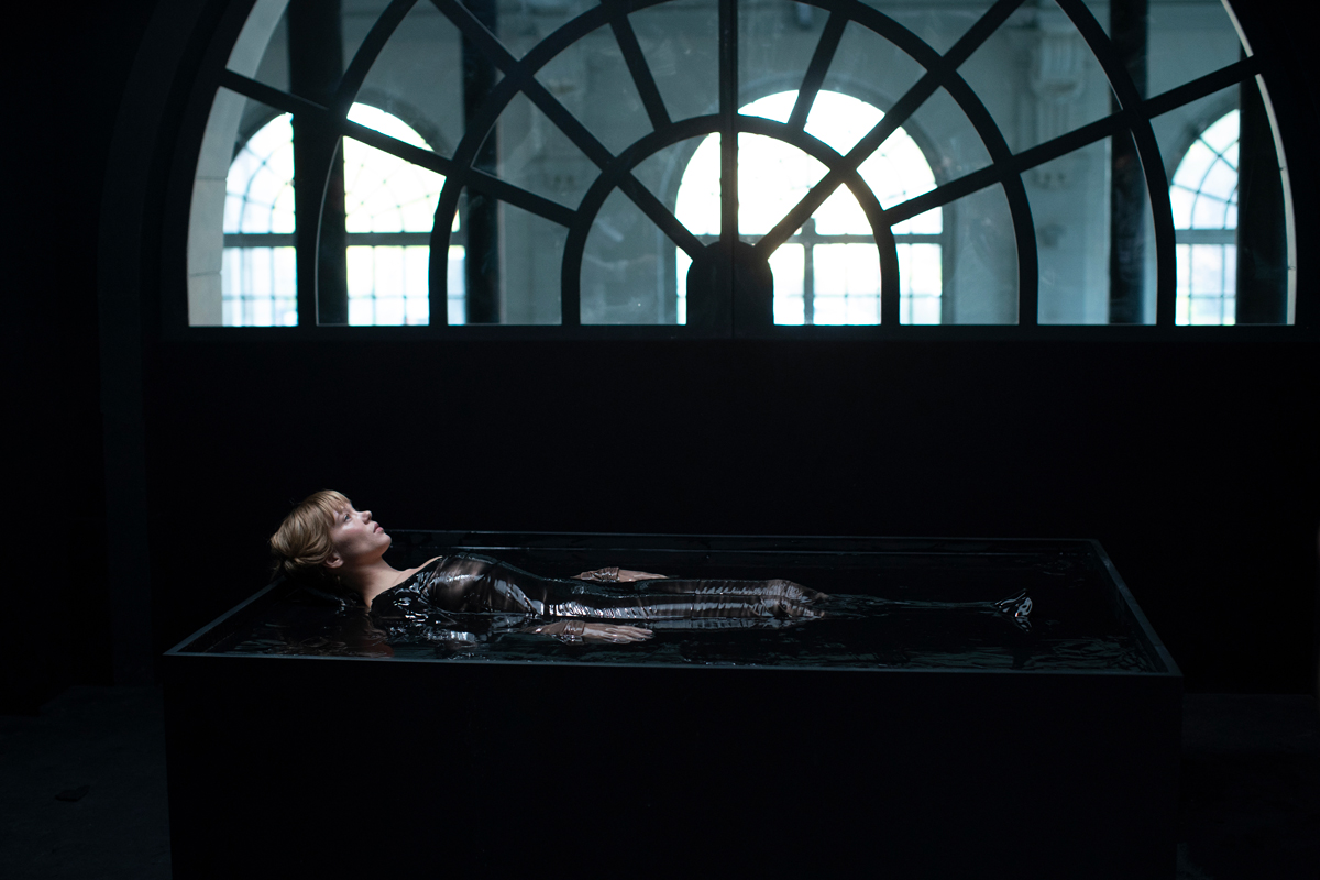 That visage, no matter the year, is often tearstained, seductive, tremulous. Agreeing to some preliminary DNA disinfecting, Gabrielle, supine in an inky bath with a needlelike probe in her right ear, revisits her past lives from 1910 and 2014. Akin to the physical structure of DNA itself, the three separate time strands operate like helices, at once running parallel to one another and twisting together. That movement, in turn, is mirrored by the action of the bodies on the various dance floors in The Beast. In 2044, for instance, Gabrielle, accompanied by an exceptionally solicitous AI companion called Kelly (Guslagie Malanda, who, in Saint Omer, gave one of last year’s most outstanding performances, as a woman on trial for filicide), goes to a clandestine club that only plays songs from 1972. Marveling at those gyrating to the Pointer Sisters’ “Send Him Back,” Gabrielle seems to have never witnessed people losing themselves so ecstatically in music before—a vestige of life before technology stamped out emotional excess. (Dance sequences are a specialty of Bonello’s, as evidenced in the forest-set mini-rave in 2008’s On War and the thronged nightclubs in his sinuous biopic Saint Laurent from 2014, which features Seydoux as YSL’s muse/model Loulou de la Falaise.)
