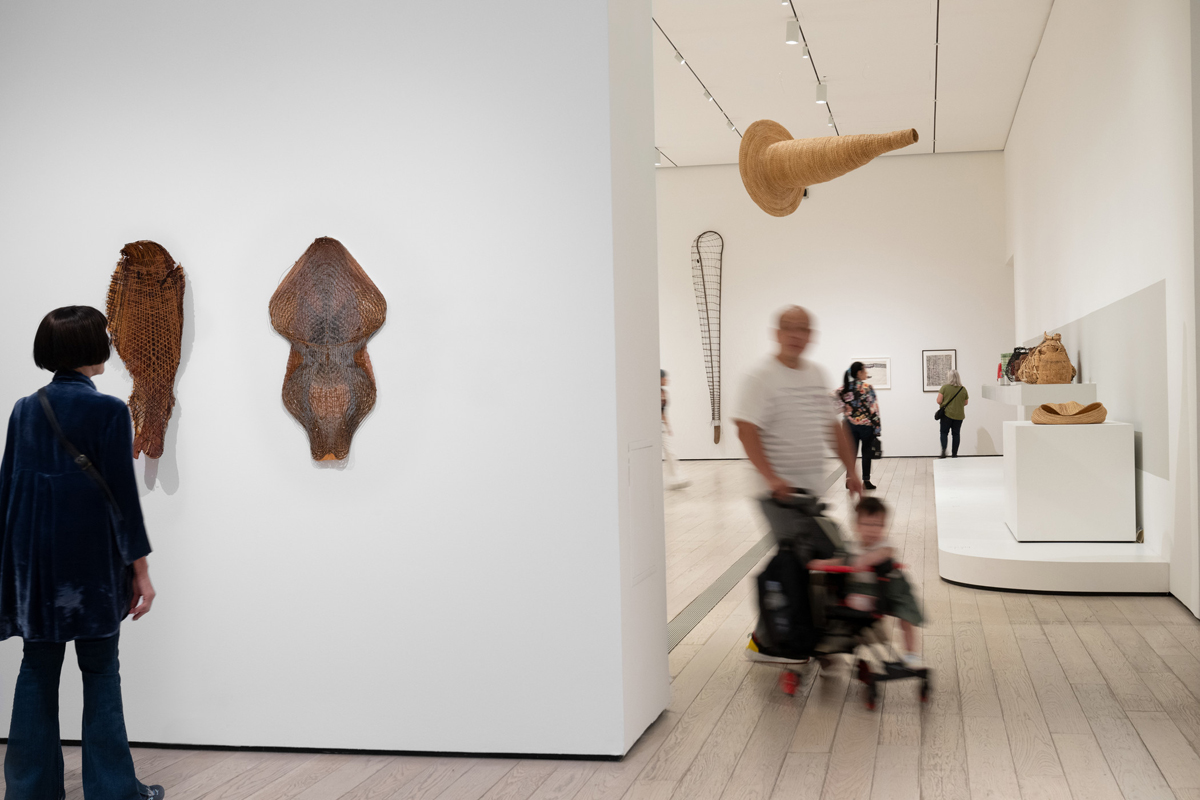 Woven Histories shrewdly traces a path from avant-garde textile design, to entanglements between weaving and painting, to the basket revival, to textiles as global industry, and, finally, to woven objects that express identity. The exhibition narrative is broad and specific in the right proportions, with a welcome touch of whimsy, and yet I gravitated more toward a shimmery side plot, about the ways that artists find community in other artists’ work. The expanded time frame of Woven Histories makes it possible to see how a stitch dropped by one artist is picked up by another, decades later.