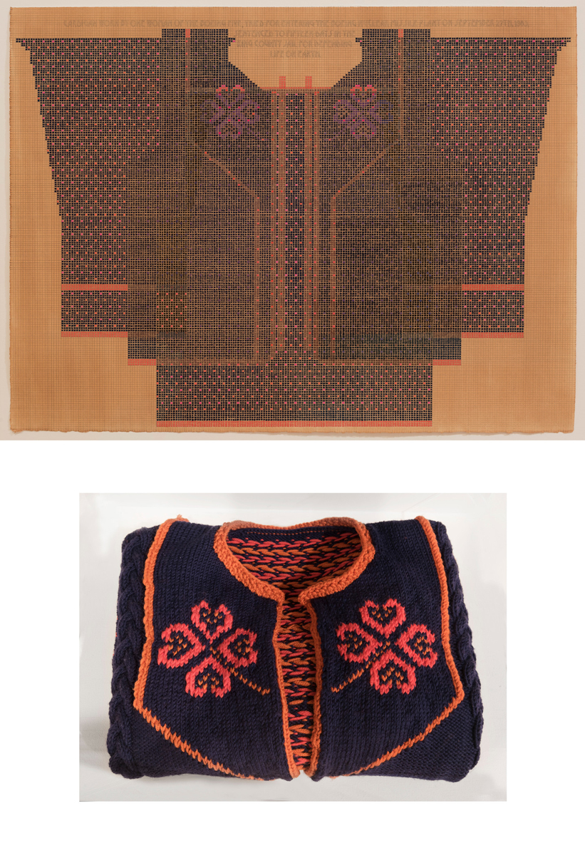 Ellen Lesperance, Cardigan Worn by One Woman of the Boeing Five, Tried for Entering the Boeing Nuclear Missile Plant on September 27th, 1983, Sentenced to Fifteen Days in the King County Jail for Defending Life on Earth, 2011. Photo: Brooklyn Museum. © Ellen Lesperance.