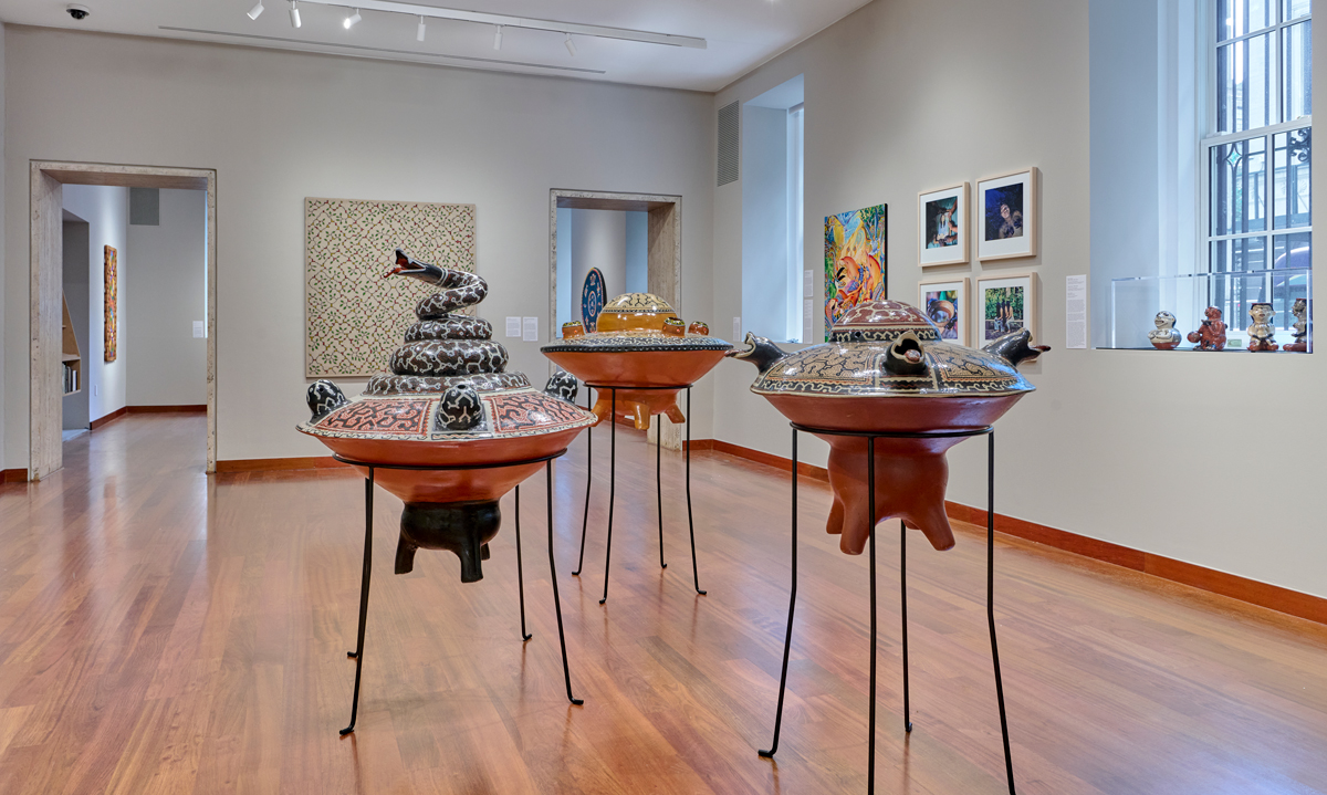 Amazonia Açu, installation view. Courtesy Art at Americas Society. Photo: Arturo Sanchez. Pictured, far left and second from left: Estela Dagua, Effigy (Supai), 1992–2004. Second from right and far right: Nancy Santi, Allpamama, 2025.