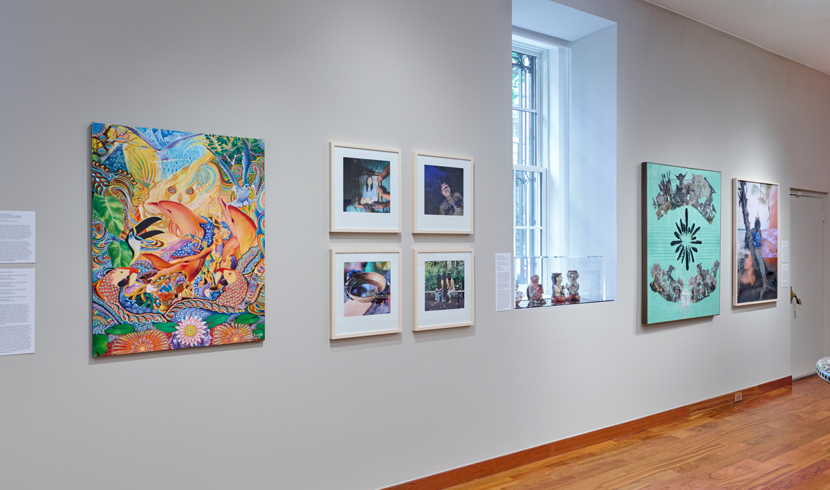 Amazonia Açu, installation view. Courtesy Art at Americas Society. Photo: Arturo Sanchez. Pictured, far left: Pablo Amaringo, El baile de los Puca-bufeos (Puca-bufeos’ dance), 2009.