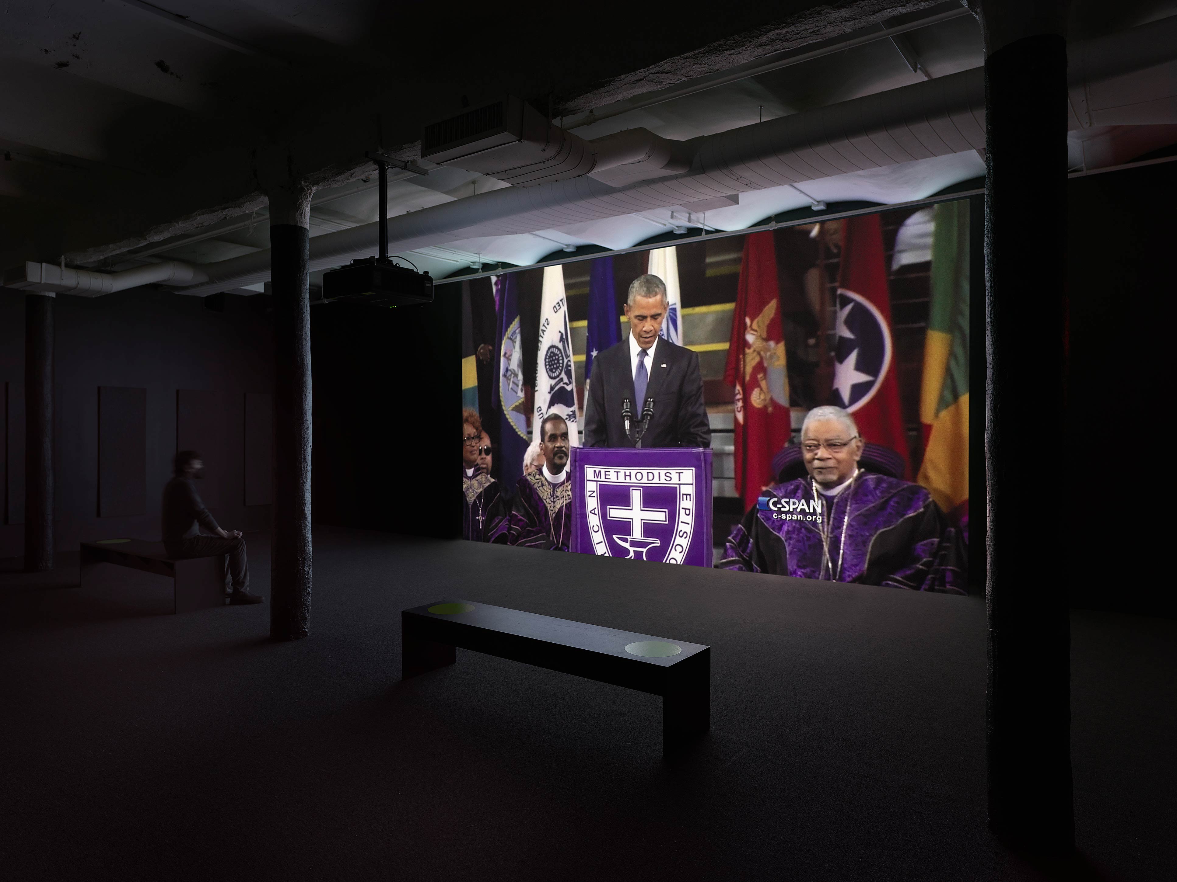 Enwezor was struck by Trump’s use of Gettysburg—site of Lincoln’s address—as a backdrop for a 2016 campaign rally. According to a museum wall text he wrote before his death, the rally attempted to superimpose Trump’s white nationalism over the complex historical interstice of the Civil War. In response, Enwezor was moved to plan a reflection into “the crystallization of black grief in the face of a politically orchestrated white grievance.”