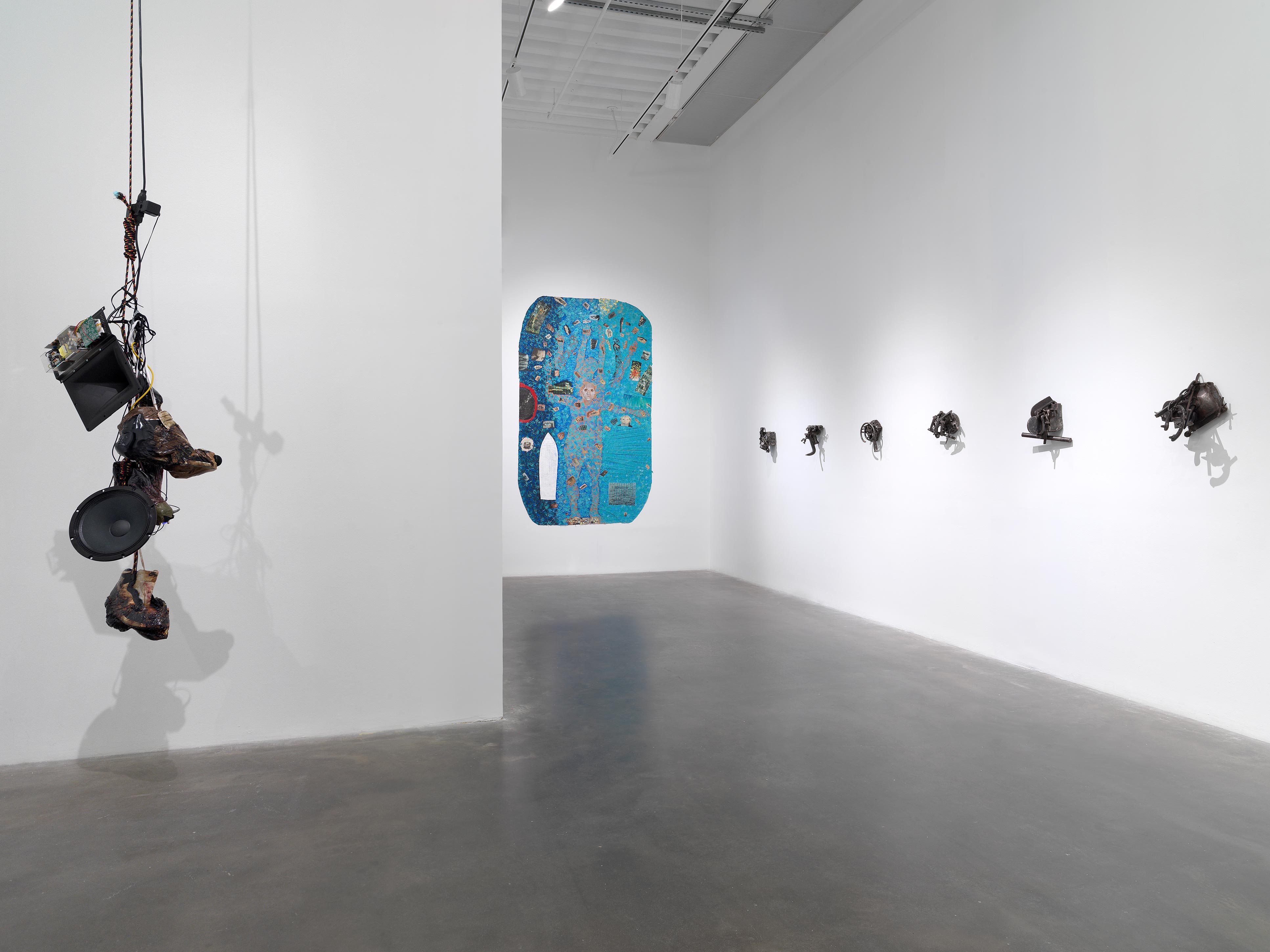 Grief and Grievance: Art and Mourning in America, installation view. Courtesy New Museum. Photo: Dario Lasagni. Pictured, left, suspended from ceiling: Kevin Beasley, Strange Fruit (Pair 1), 2015.