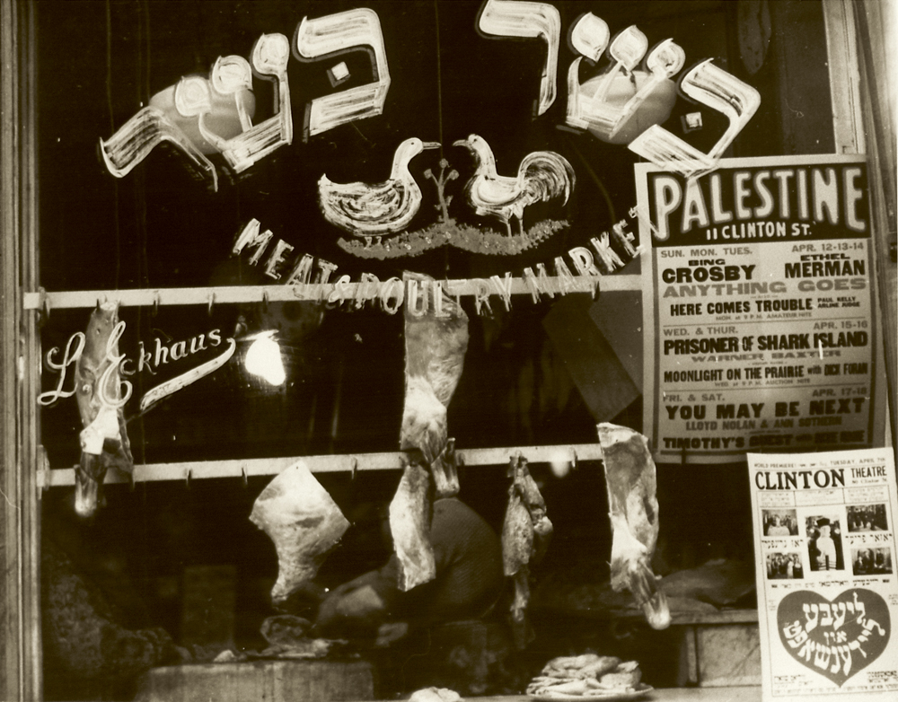 Surrealism was admired but rejected by Shahn, because he thought that the unconscious cannot create art “as the very act of making a painting is an intending one.” For him, intention was the determining factor of composition. Still, as viewers in the museum galleries today, we are all left to contemplate our own unconscious associations. One memorable photograph shows a storefront—Untitled (Lower East Side, New York City) (1936). The plate-glass window of a kosher butcher displays a poster for a production appearing at the Palestine Theatre on Clinton Street, starring Bing Crosby and Ethel Merman. The word Palestine signaled my attention.