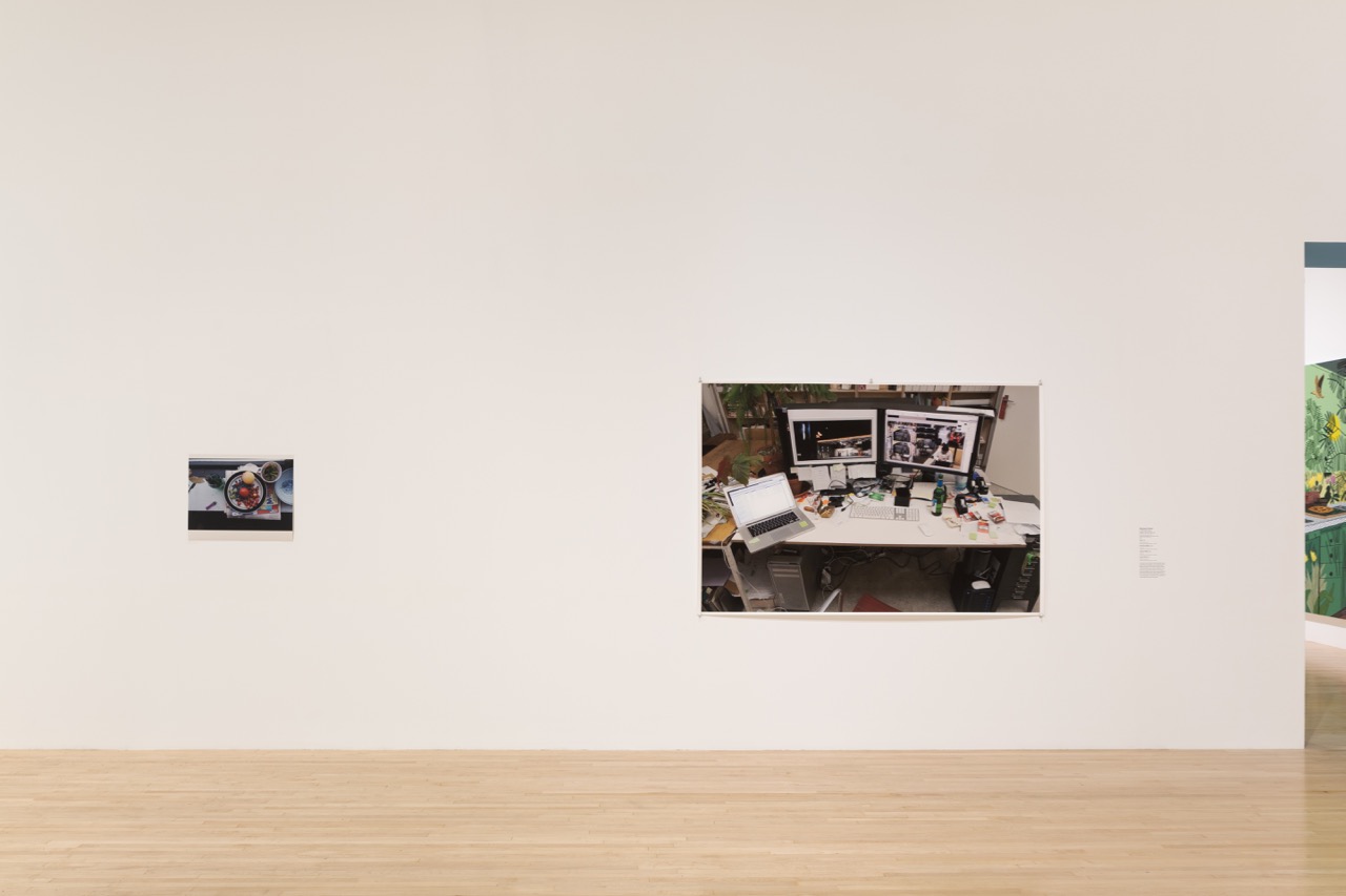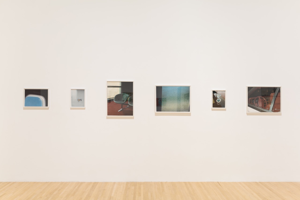 Midway through the show, Moyra Davey’s Empties (2017), elegiac photos of spent liquor bottles in still emptier rooms, testify to nights passed. On the opposite wall Wolfgang Tillmans’s large-scale photograph of his own cluttered desk (studio still life, c. 2014)—computer monitors, a green beer bottle, a tape dispenser, and cigarettes packs emblazoned with “SMOKING KILLS”—appears like an answer song to Farber’s earlier paintings. At one end of the gallery wait Blair’s mesmerizing photorealist gouaches, hauntings of mundane spaces and objects—a lone martini, a molded plastic chair in an airport, an ashtray, the rounded edge of an airplane window—images of life slowed down enough that you can feel it passing.