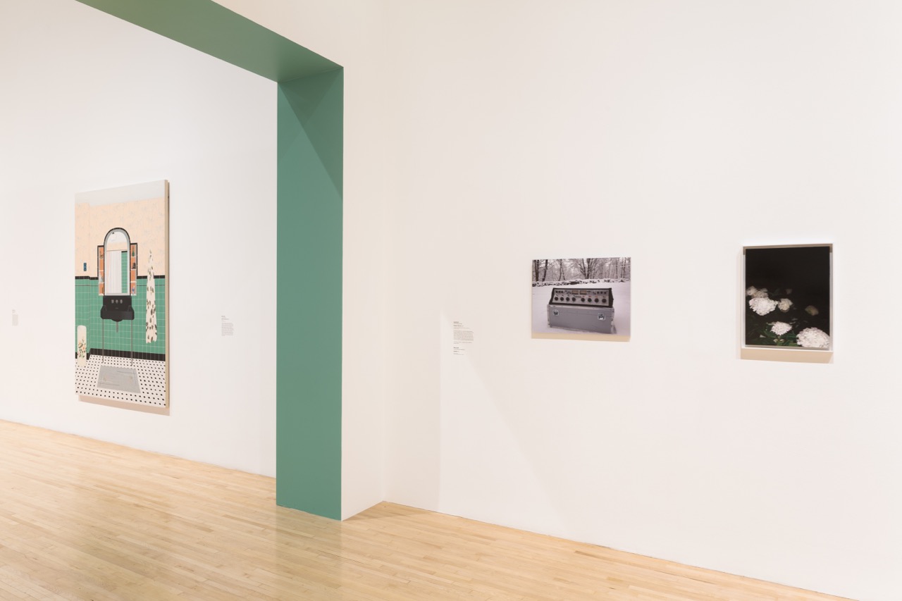 Recurring themes and motifs emerge, such as the presence of household pets, delight in the natural world, and lemons. Some linkages among the works are obvious: the flowers that litter Farber’s paintings, Jordan Casteel’s painting of a funeral wreath in a trash can (Memorial, 2017), and the flamboyant floral arrangements that Maurice Harris delivers weekly to the museum. Others aren’t as overt but no less resonant, like Dike Blair’s oil painting (Untitled, 2017) of white hydrangeas blooming in the dark next to musician Quintron’s photograph of new-fallen snow on his analog synthesizer, Weather Warlock (2011), nature and machine in unexpected harmony. In some cases, a termite-like intensity manifests in the simple act of mark-making, from the vibrant slashes of color in Joan Brown’s Woman Waiting in a Theatre Lobby (1975) to the muted, repeating dabs of paint in Jennifer Guidi’s near-abstract landscapes. Throughout the galleries Farber’s ecstatic still lifes appear like Easter eggs or friendly faces at a cocktail party. A good one, though it has a melancholic strain.