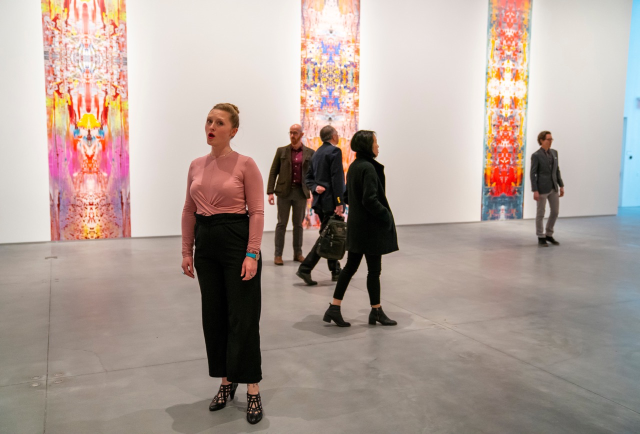 Though both wallpaper and tapestries have domestic connotations, it’s hard to imagine in whose home these pieces might hang—perhaps the Malibu aerie of a VC billionaire easing into early retirement. As the audience mills about and gazes at the walls, a chorus dressed in street clothes materializes around the room’s periphery and begins to sing. (On the day I attended, the Choir of Trinity Wall Street performed; they alternate with the Brooklyn Youth Chorus for the entirety of the show’s run.) Drei hirtenkinder aus Fátima (2014) was written by Pärt, the Estonian liturgical composer, age eighty-three. The piece, based on an apparition of the Virgin Mary as witnessed by the titular three shepherd children, was first performed amid a Richter exhibition in Basel and is dedicated to the painter. Though Richter and Pärt had long admired each other, this was their first collaboration. This NYC performance reprises that collaboration. Pärt deploys his trademark tintinnabuli (bell-like) method in this amiable a cappella choral piece. Both pleasant and melodious, his plangent composition draws equally from medieval plainsong and the soothing progressions of minimalist sequencing. It’s clear why he is the world’s most frequently performed living composer—his pieces deliver gravitas through an exceedingly accessible musical dialect, the somber “allelujah” choruses marked by euphony and civility.