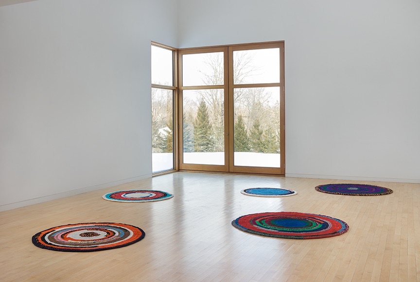 Harmony Hammond: Material Witness, Five Decades of Art, installation view. Pictured, from left, clockwise: Floorpiece V, IV, II, III, and VI, all 1973. Image courtesy the artist and Alexander Gray Associates. © 2018 Harmony Hammond / Licensed by VAGA at Artists Rights Society. Photo: Jason Mandella.