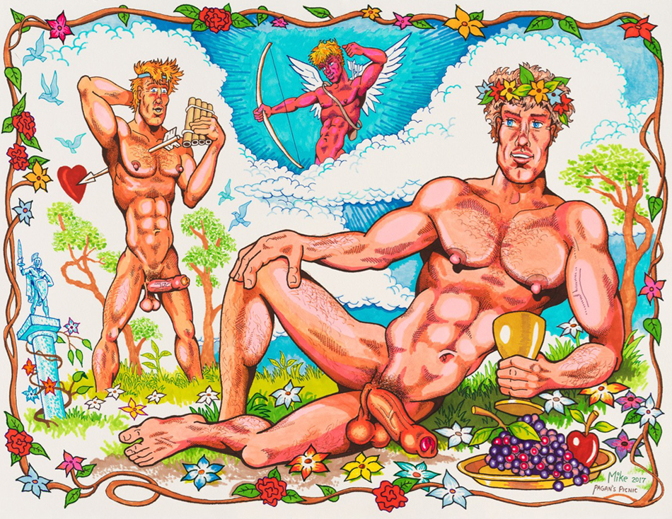 Mike Kuchar, Pagan’s Picnic, 2017. Felt tip pen and ink on paper, 29 × 22.5 inches. Image courtesy the artist, Anton Kern Gallery, and Ghebaly Gallery.