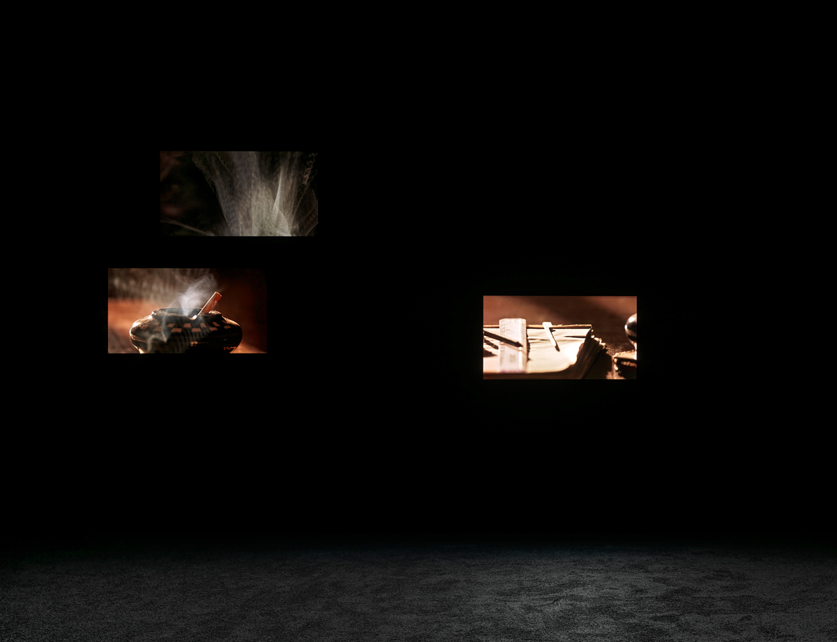 Amar Kanwar: The Peacock’s Graveyard, installation view. Courtesy the artist and Marian Goodman Gallery. Photo: Alex Yudzon. Pictured: The Peacock’s Graveyard, 2023 (still). Digital video installation, seven screens, dimensions variable, 28 minutes 16 seconds.
