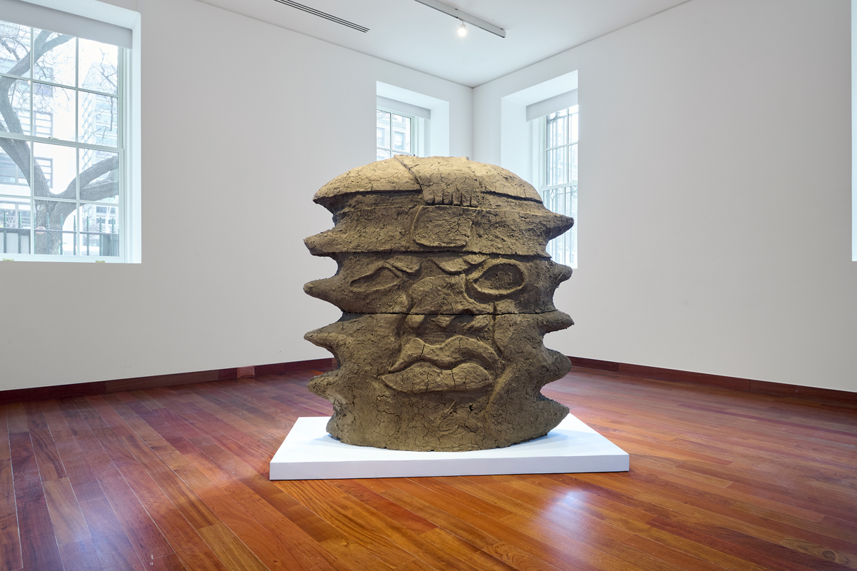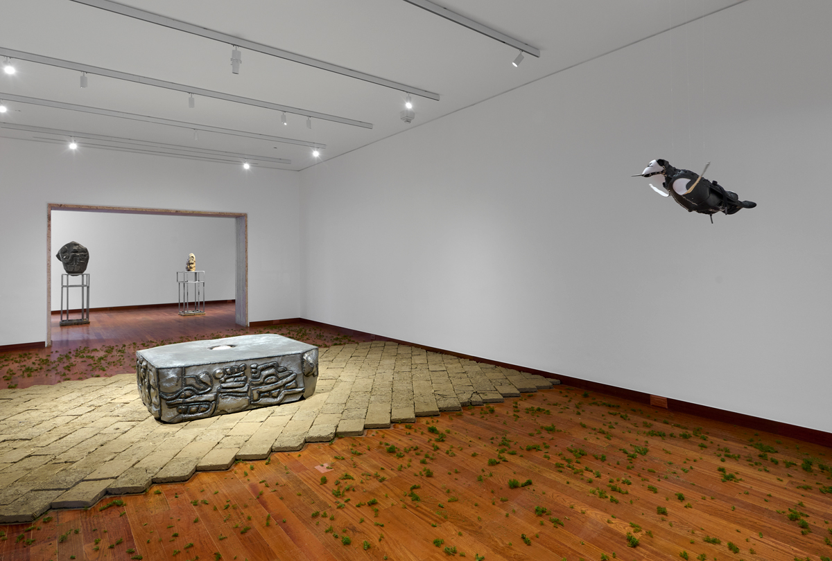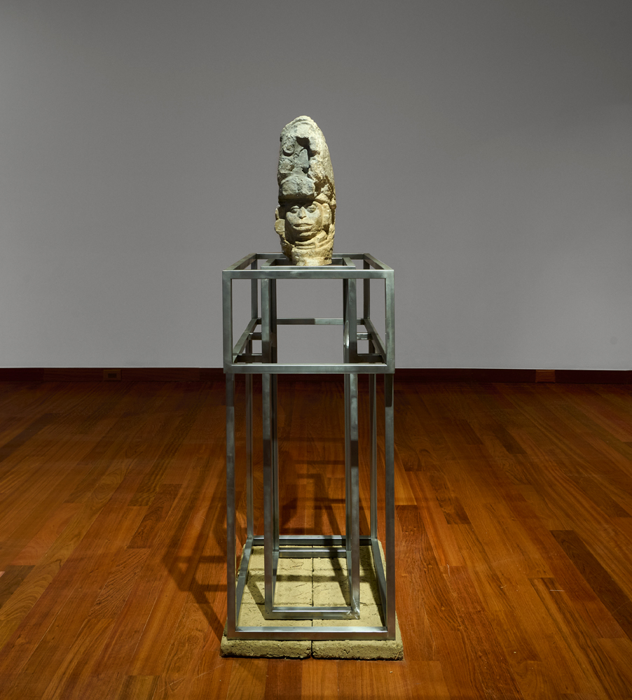 Beatriz Cortez x rafa esparza: Earth and Cosmos, installation view. Courtesy Art at Americas Society. Photo: Arturo Sanchez. Pictured: Beatriz Cortez, Gift of the Artist to the Ancient Object Labeled as Human Head Emerging from Monster Jaws, One Migrant to Another, in Memory of your True Name and your Land, 2022–23, recreated 2024.