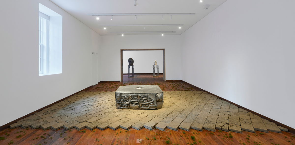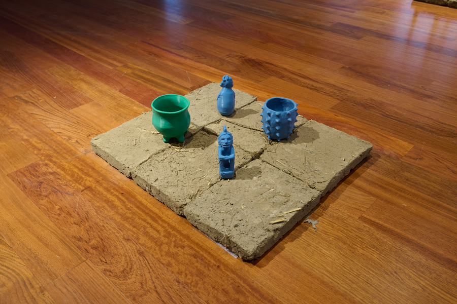 Beatriz Cortez x rafa esparza: Earth and Cosmos, installation view. Courtesy Art at Americas Society. Photo: Arturo Sanchez. Pictured, platform surface beneath replicas: rafa esparza, Adobe Bricks, 2024.