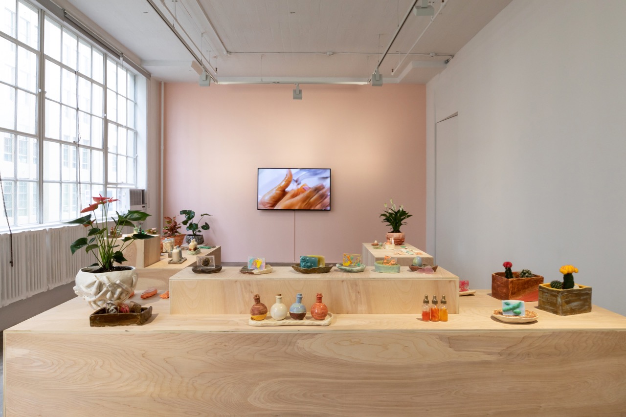 Ms. Harris’s well-manicured fingers range over her bathroom countertop, strewn with all manner of what are clearly handmade beauty tools, devices, vials, and potions; those same objects are on display in the gallery, arranged artfully on stylish wooden plinths, juxtaposed with flowers and plants as in a luxe boutique. (A second room includes an array of soaps lined up on a wall shelf and several collages derived from the pages of wellness magazines.) Made of ceramic and resin, sometimes glazed sloppily and often embedded with found objects and other materials (car air fresheners, neon-orange corn puffs, flowers, sand, grout), these self-care products are utterly useless: the soaps do not lather; the Cheetos face serums—even if you ever wanted to put them on your skin—are cast, solid forms, fused with their vials; the face rollers do not roll; the sponges are not spongy. Many of the tools are present only as absences—we are served up their molds instead of the objects themselves. The sleek, clean, inviting aesthetic of display stands in stark contrast to the abjectness of its offerings.