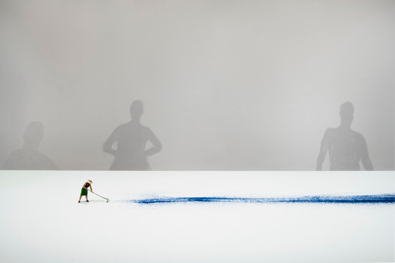In the handful of galleries that make up the elegantly hung and expansive-seeming show, we are confronted with several small installations centered on tiny people-substitutes undertaking impossibly huge tasks. A small man in a white smock is mounted on a wooden block on one wall; from his paintbrush seems to emanate a French blue swath of paint that grows bigger and bigger, enveloping a good part of two walls of the room (Man Painting, 2018). Nearby, another figure begins the herculean job of painting a leg of a full-sized chair, many, many times his height, that same shade of blue (Untitled [Man Painting Chair III], 2015). In Man with Pickaxe (2017), a miniscule man chips away at the long wooden plinth on which he stands (it must be at least eight feet long to his inch or so height), presumably intent on destroying his own foundation. Forced Labor (Sweeping Woman) (2004–18) has a woman in a green skirt and straw hat cleaning up a spill of blue sand that stretches almost endlessly before her. Another woman, all in pink, sits on a tiny bench, knitting; the result of her efforts is the delicate mound of pink fabric that covers most of the large white box on which she is installed (The Weaver, 2017). One man tries to tune a smashed toy piano many times his size (The Task [Black Piano], 2016), while another tries to wind a crushed clock (To Fix it 3:30, 2016).