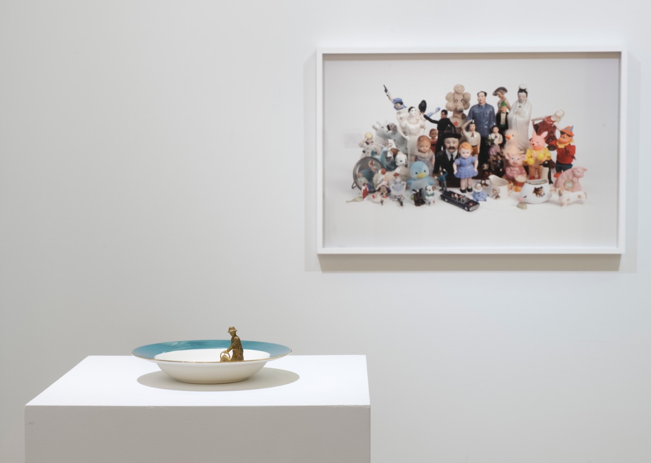 The image is a light-handed demonstration of the ways in which our objects of veneration become—quite literally—objects of consumption and vice versa, and the sometimes laughable degree of leveling that occurs as a result. Porter delights in bringing together the most unlikely bedfellows in photographs of her collected treasures. The Intruder (2011), for example, assembles a plaster Chairman Mao, a Japanese porcelain doll, a small plastic Pinocchio, a sow and her piglet in the form of a clock, a Jesus keychain, a fuzzy duckling, a saucy poodle, a creamer illustrated with Lassie and a sugar bowl with George Washington, and, eerily, a small toy car—a replica of the black convertible the Kennedys were riding in, with teeny-weeny figures representing JFK and Jackie, on the day of the president’s assassination. All these characters look happy to be together, even though, by virtue of differences in their style, functionality, temporality, politics, and even species, they would never share the same space except in Porter’s whimsical collection. The effect reminds one of Borges’s description of a (fictional) Chinese encyclopedia—The Celestial Emporium of Benevolent Knowledge—which offered an unconventional, if hardly disputable, alternate taxonomy of animal classification: those that belonged to the emperor, embalmed ones, those that are trained, suckling pigs, fabulous ones, stray dogs, etc.