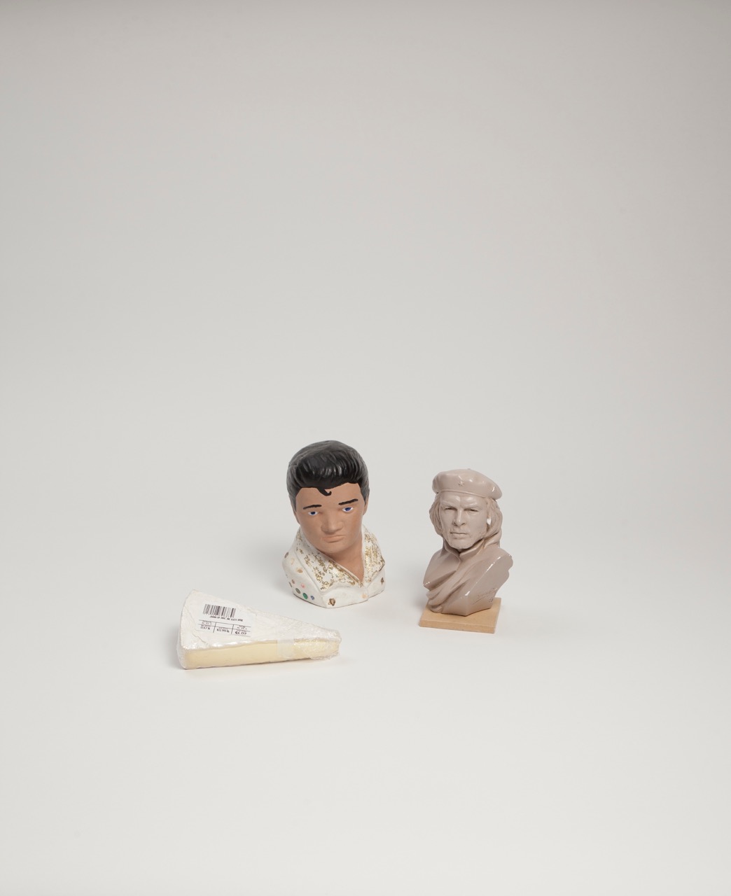 The first work on display is Joan of Arc, Elvis, Che (2011), in which stand-ins for the three icons are photographed against an unmodulated, white background. We are given no context, no sense of scale, nothing to indicate why the saint, the star, and the revolutionary are brought together. Elvis, in the middle, is a souvenir effigy, his doughy face and sparkly jumpsuited shoulders painted with a plodding hand; Che is a plaster bust mounted on a small piece of wood, all piercing gaze and chiseled cheekbones and fashionably voluminous scarf; and Joan of Arc is . . . a plastic-wrapped hunk of Brie. Yes, the cheese—this particular brand name has delusions of epic martyrdom, apparently.