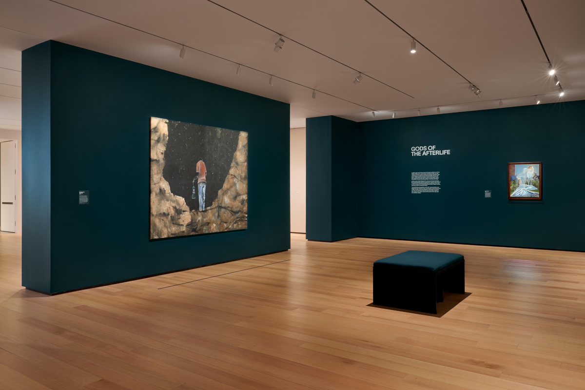 Noah Davis, installation view. Courtesy Philadelphia Museum of Art. Pictured, far left: Forty Acres and a Unicorn, 2007. Second from left: Delusions of Grandeur, 2007.