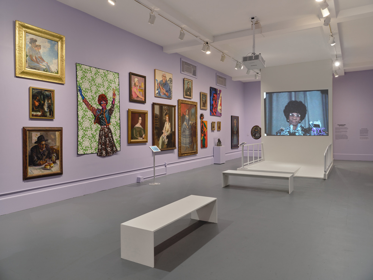 Another room, organized around the depiction of the nude (“Surface Tension”), asks us to think about agency “in a time of heightened visibility and contentious control over human bodies.” “A Quiet Place” explores the question of who has access to rest, an idea informed by the work of Tricia Hersey of the Nap Ministry and Cole Arthur Riley of Black Liturgies. “Witness” focuses on portraiture as a form of self-determination; at the center of the room is a platform where viewers can scroll through a series of short film clips, including one of Shirley Chisholm “bearing witness” in a fiery political speech made in Brooklyn.
