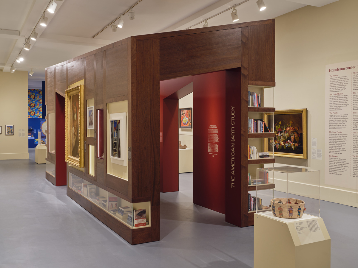 At the heart of the second room of the installation, devoted to the idea of “Radical Care,” is a freestanding structure with glassed-in bookshelves called “The American (Art) Study,” announcing clearly the curators’ intention of making transparent the “learning and unlearning” that underpins their strategy. (Full disclosure: my book is on a shelf about whiteness.) It’s a form of citational politics—paying homage to the thinkers who have laid the groundwork for their efforts, or naming those whom they’re pushing against—and a declaration that caring about an audience means letting them become part of the thought processes that shaped what they’re seeing. Additionally, labels marked “Showing Our Work” appear throughout the galleries, explaining certain curatorial choices. This move toward self-referentiality is refreshing, and for the most part I wholly approve. Occasionally it gave me pause, though, by foregrounding the curators’ voices in ways that are a little too much, as with an audio recording in the first gallery, accompanying Louis Rémy Mignot’s painting Niagara (1866), of Sparling Williams reading one of her own poems. But never mind—what we have here is a proposal, which will surely be revisited over time, that begins a genuinely consequential undertaking of challenging the authority of the past by asking it to speak to the present.