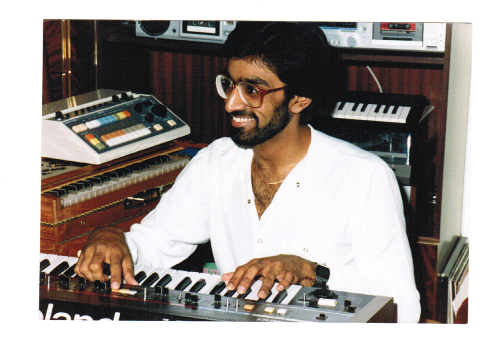 Kuljit Bhamra pictured with the CR-8000 drum machine (top left) in his home music studio in Southall, London, ca. 1982.