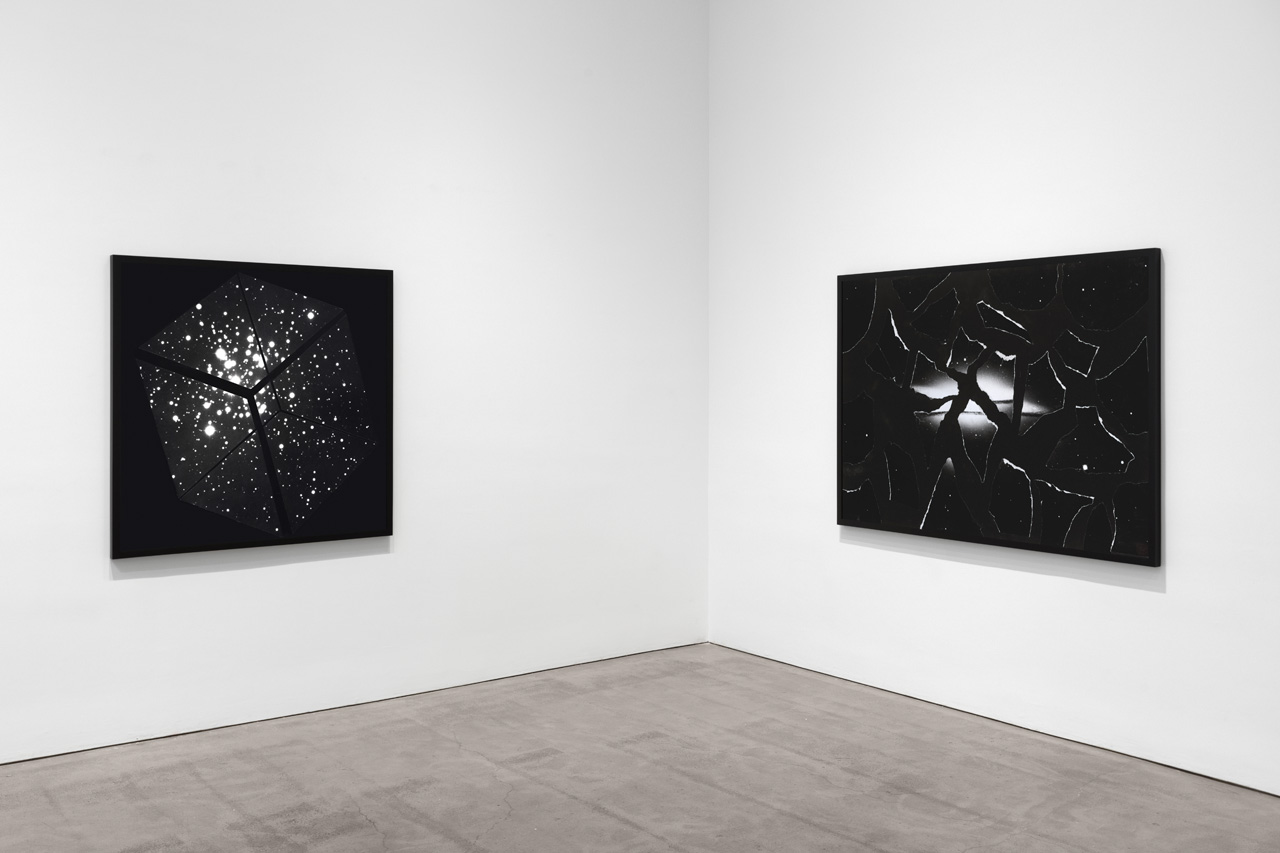 Sarah Charlesworth, installation view. Photo: Steven Probert. Pictured: Cube #2, 1981 (left) and Spiral Galaxy MGC4565, 1981 (right).