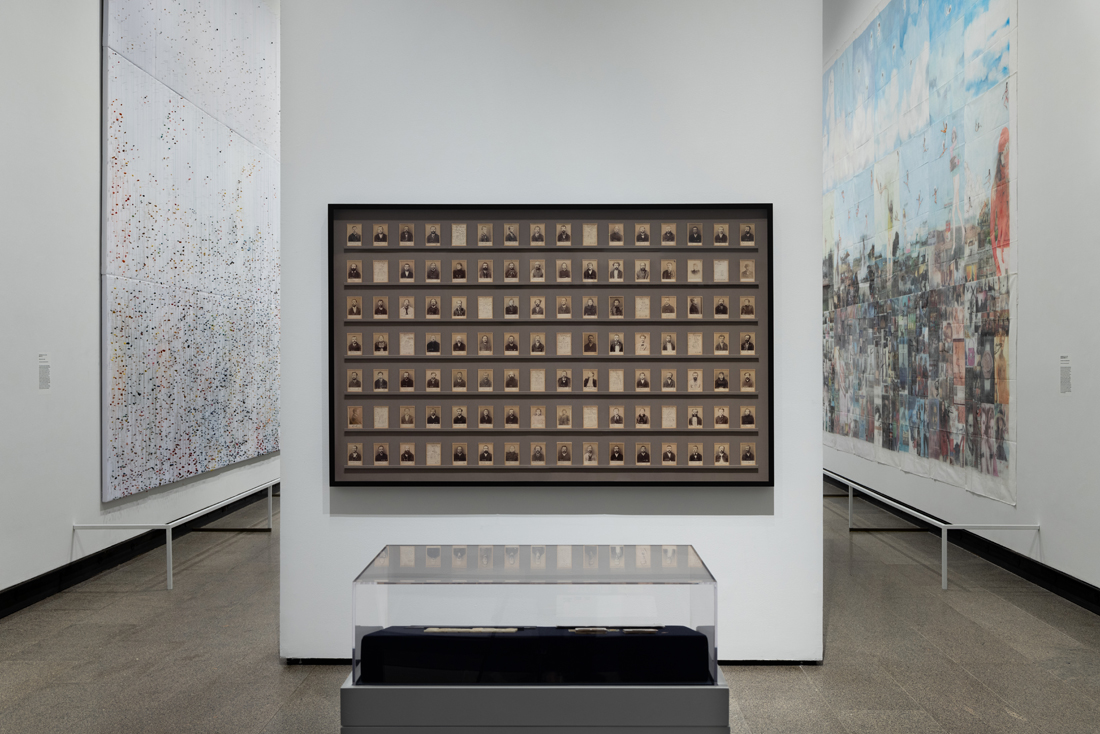 Jesse Krimes: Corrections, installation view. Courtesy Metropolitan Museum of Art. Photo: Hyla Skopitz. © Metropolitan Museum of Art. Pictured, center, on wall: Alphonse Bertillon, Mugshots of Suspected Anarchists, from French Police Files, 1891–95.
