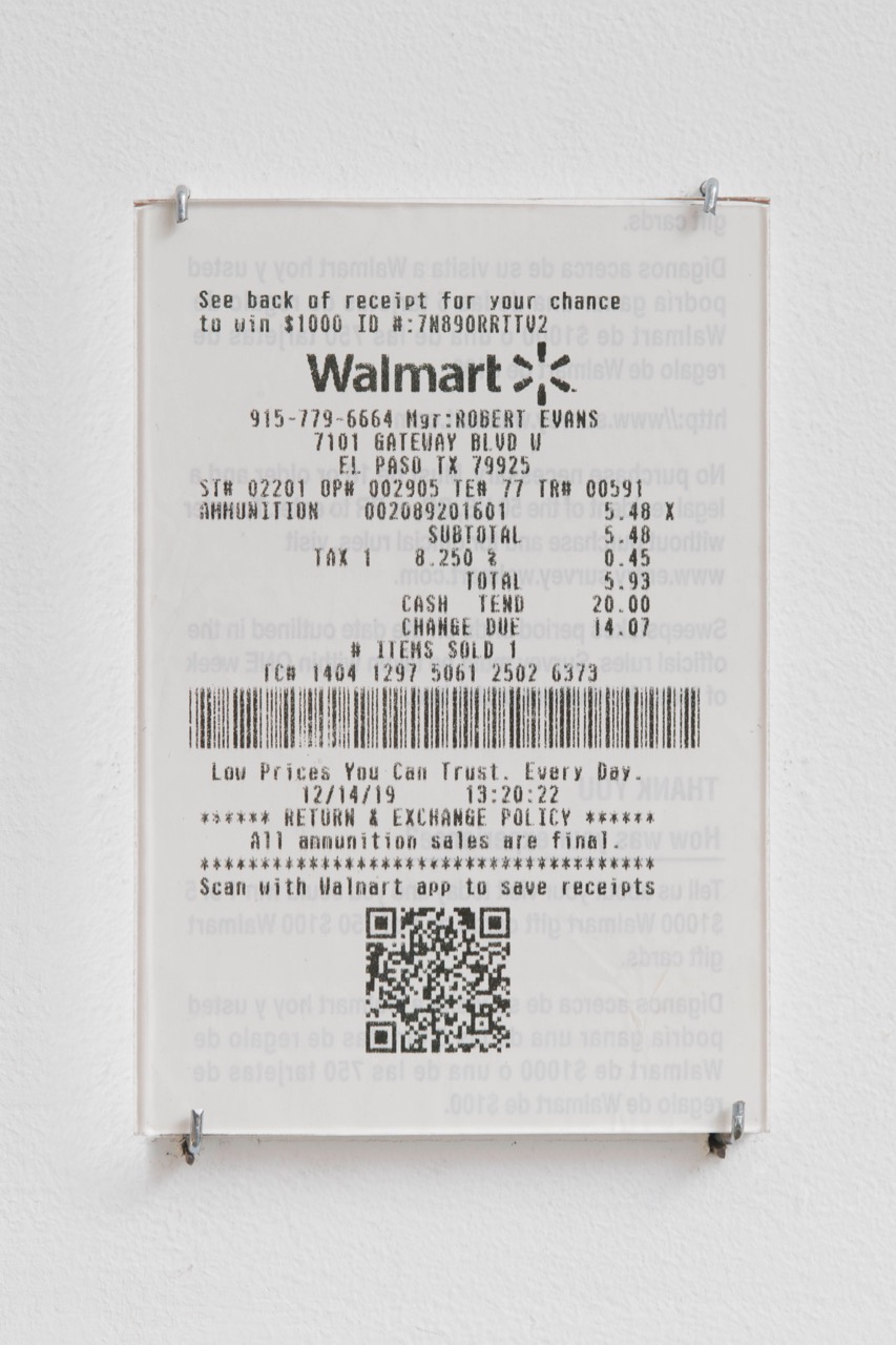 Teresa Margolles, Receipt, 2020. Receipt from purchase at Walmart, Gateway Blvd, El Paso, TX, 5 1/4 × 3 1/8 inches. © Teresa Margolles 2020. Image courtesy the artist and James Cohan. Photo: Phoebe d’Heurle.