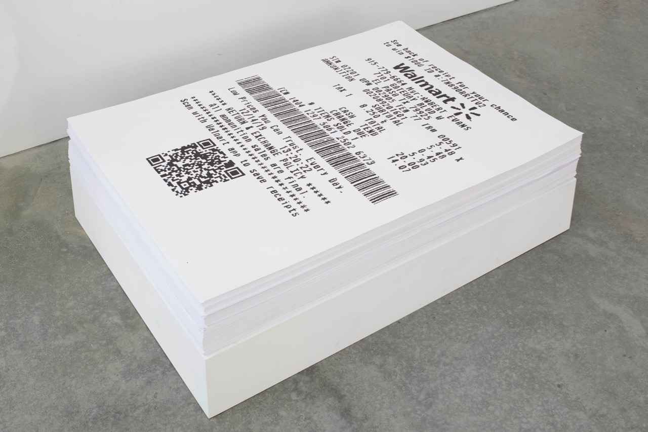 Teresa Margolles, Receipt, 2020. Stacked facsimiles of receipt from purchase at Walmart, Gateway, Blvd, El Paso, TX. © Teresa Margolles 2020. Image courtesy the artist and James Cohan. Photo: Phoebe d’Heurle.