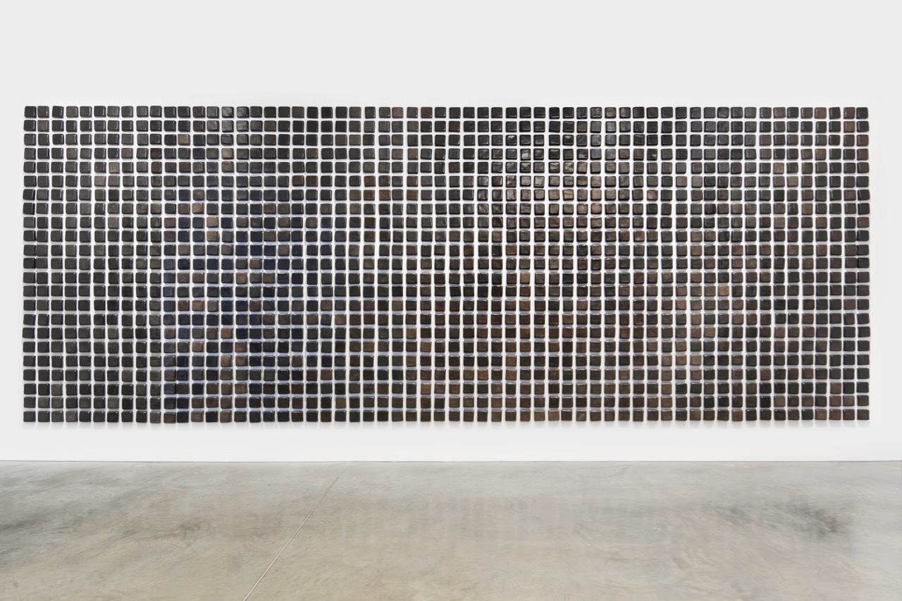 Teresa Margolles, El manto negro / The black shroud, 2020. Burnished ceramic pieces handmade by artisans in Mata Ortiz, Mexico, each approx. 4 1/8 × 4 3/8 × 1 3/8 inches. © Teresa Margolles 2020. Image courtesy the artist and James Cohan. Photo: Phoebe d’Heurle.