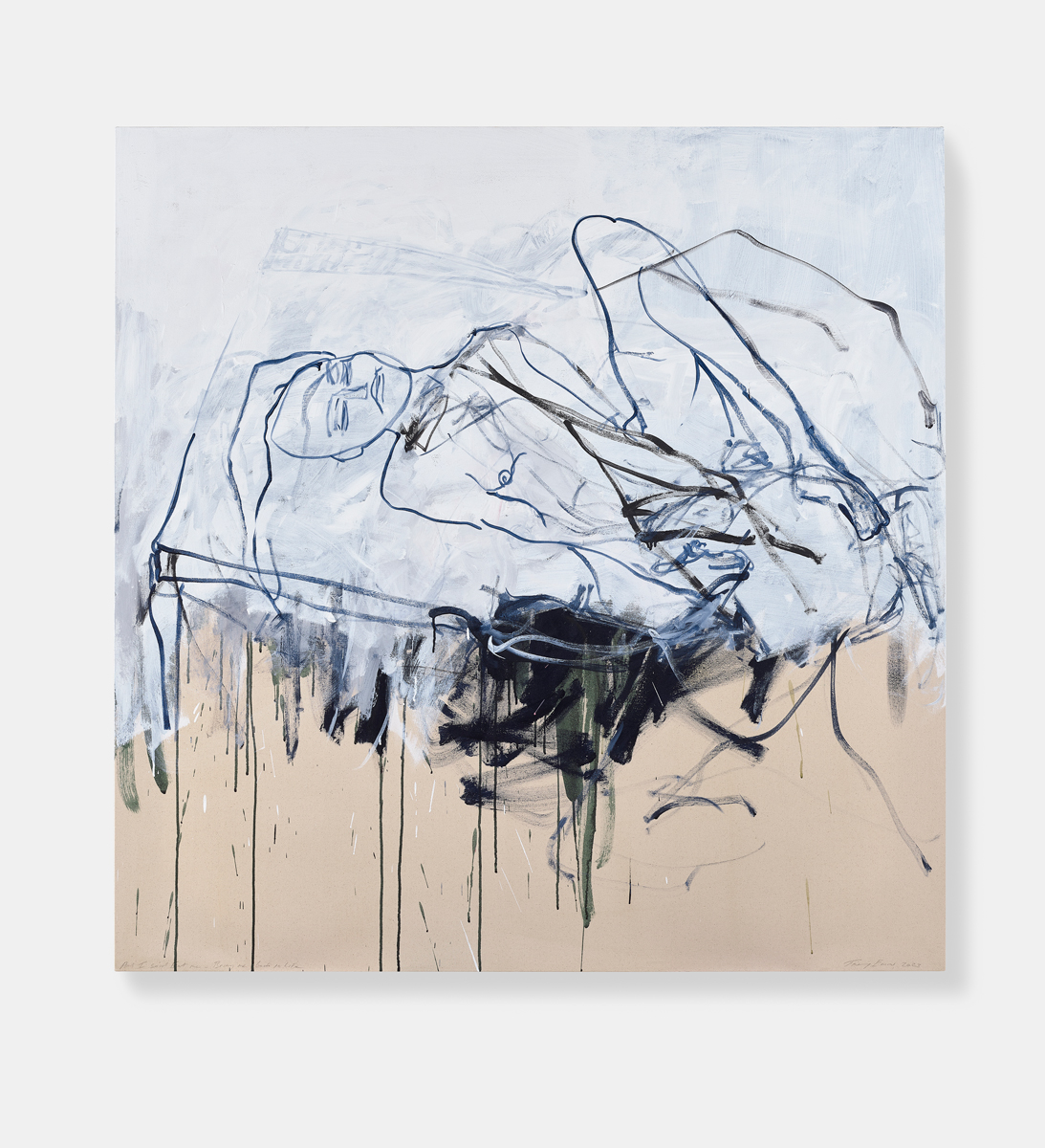 In Tracey Emin’s new show, gracefully or crudely outlined bodies are beached on islands of bleeding brushwork, float in faintly rendered rooms, or disappear into tangled, hazy spaces. Lovers Grave, as the exhibition is titled, fills White Cube’s new location on the Upper East Side with a cycle of commanding large-scale paintings on floors one and two, while the cellar gallery presents a dozen small pictures with faint ribbons of penciled script along their bottom edges—handwritten phrases that seem like captions more than titles—lending them an unguarded, diarylike presence. Her first New York solo exhibition in seven years contains no surprises, visually speaking. The work’s airy urgency, its naked expanses of unprimed canvas and naked figures, the calligraphic or slashing brevity of Emin’s line: all are familiar. Still, it feels fresh. With characteristic directness, the British artist unfurls the most recent chapter of the life story that legions of admirers (and, these days, fewer skeptics) have been following for many years.