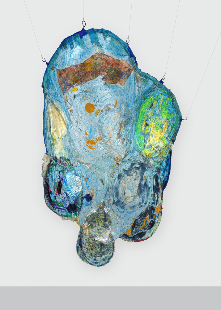 On the sixth floor, Suzanne Jackson and Harmony Hammond, both Biennial first-timers born in 1944, demonstrate the oblique radicalism of abstract painting at its very best—Jackson with an airy garden of hanging compositions, like multicolor curtains or carapaces of hardened gel medium, embedded with netting, shredded mail, and clothing hangers; Hammond with her weathered, punctured, patched canvases, including a tattered version of a Malevichian black cross. The pair are represented by recent works, but they have long labored to highlight the allusive, gendered qualities and cultural, craft references of their materials. They’ve also acted behind the scenes, laying the groundwork for alternative art worlds and movements. In the late 1960s, Jackson opened Gallery 32, an experimental space in Los Angeles devoted to the work of Black artists; in the 1970s, Hammond was an organizer of lesbian group exhibitions and a founder of the feminist gallery A.I.R as well as Heresies magazine.