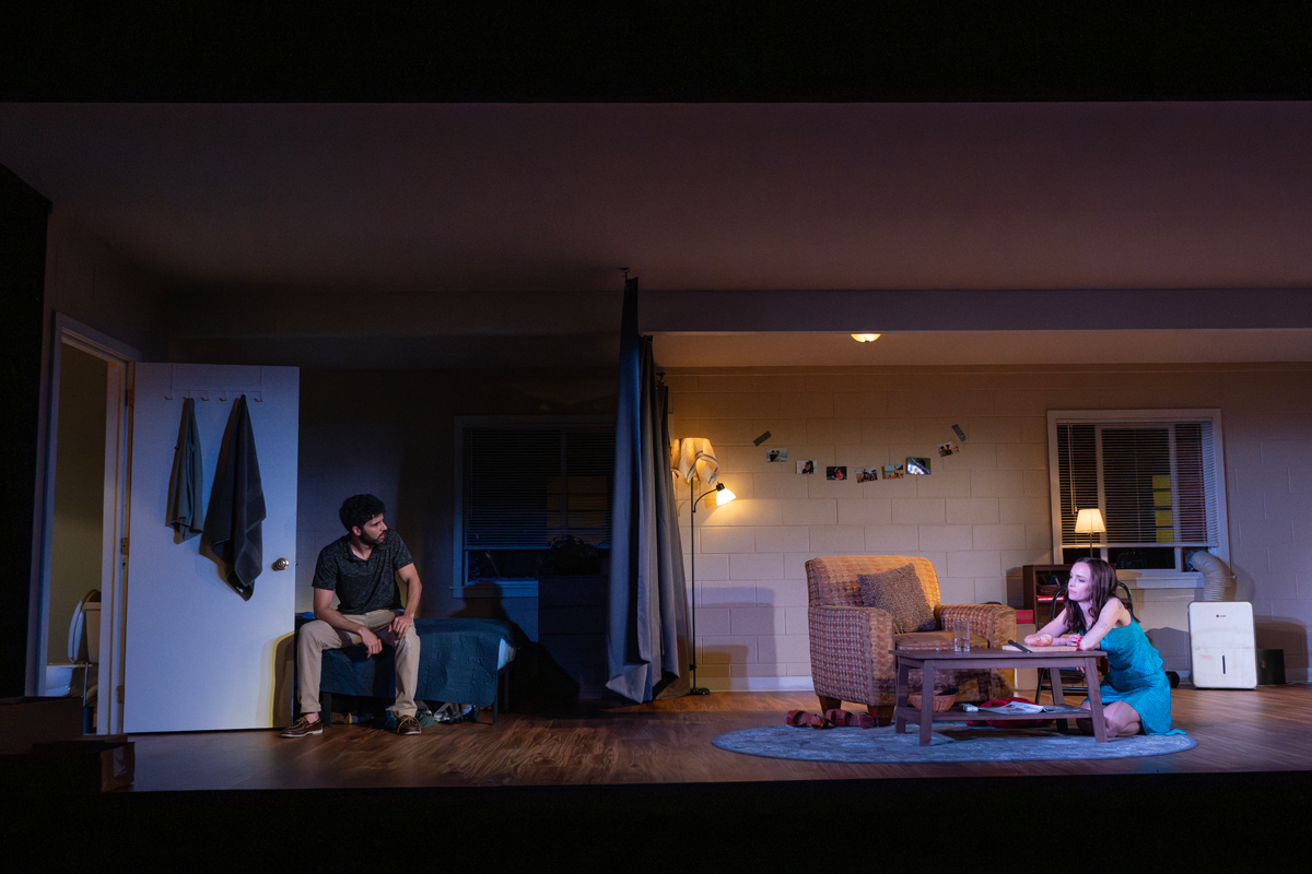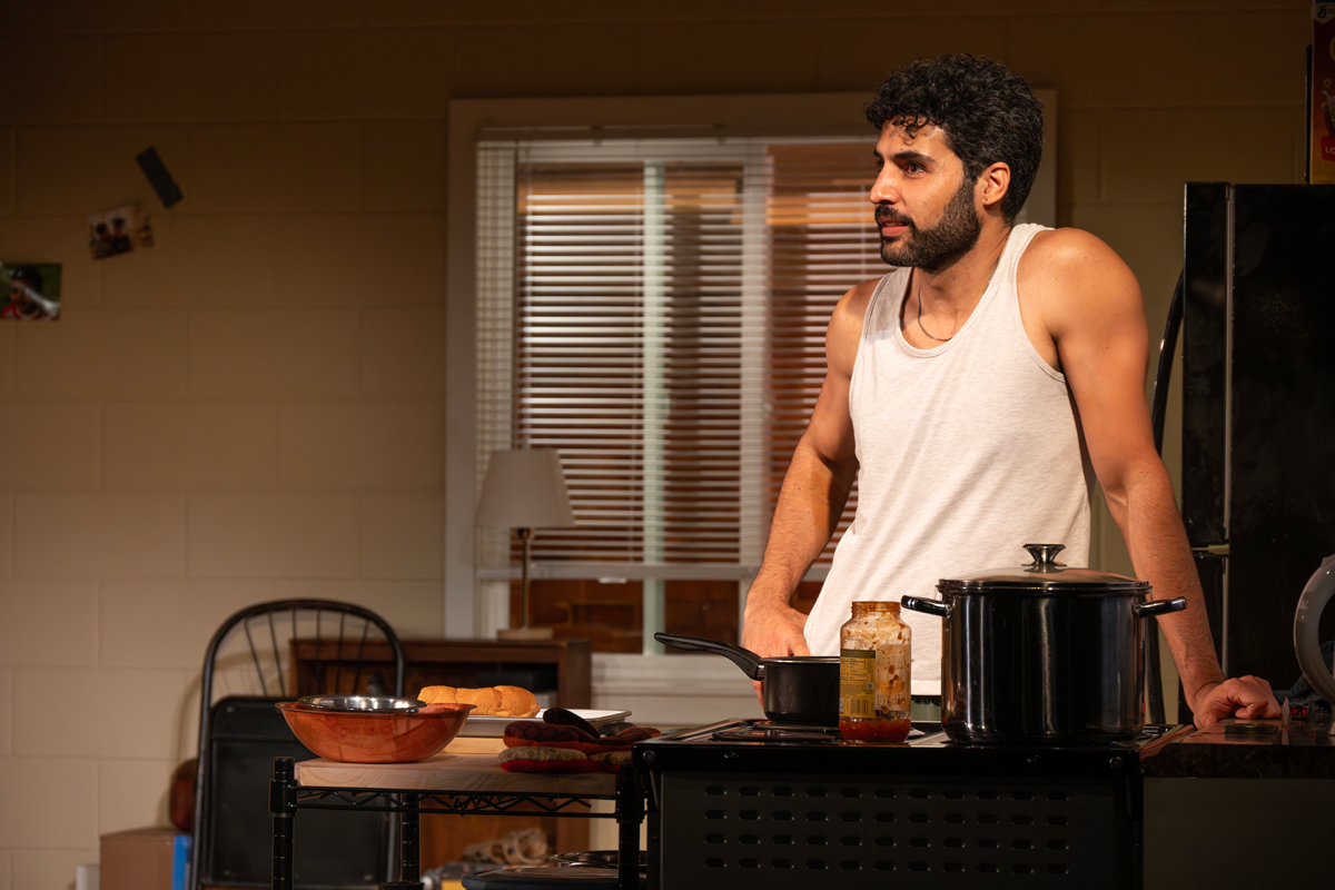 That “friend” would be David (Babak Tafti), a Brown man in his late thirties Paul is sponsoring, who is alone onstage as the show begins and is readying dinner for an imminent Tinder date. At one point in this largely one-sided conversation, Paul, who is white, encourages David to lean into his race—to use his “immigrant thing” and the fact that he was adopted (“all the teens sayin that’s trauma now”)—to obtain unsupervised overnight visits with his teenage son, who lives with his ex-wife. In a previous life, David had worked as a high-school physical education teacher and basketball coach. He enrolled in the SA program after he was revealed to have exchanged racy text messages with a seventeen-year-old girl at his school; a restraining order was also put in place after he sent some “really intense, argumentative emails about custody stuff” to his ex. As Paul talks at him, David cooks pasta in the kitchenette of his South Carolina studio, which is divided by a flimsy curtain, the kind you might see in a hospital ward or a college dorm. Throughout the play, it falls down repeatedly—a visual metaphor that feels, frankly, a little too eager to announce itself. (Arnulfo Maldonado designed the grungy set.)