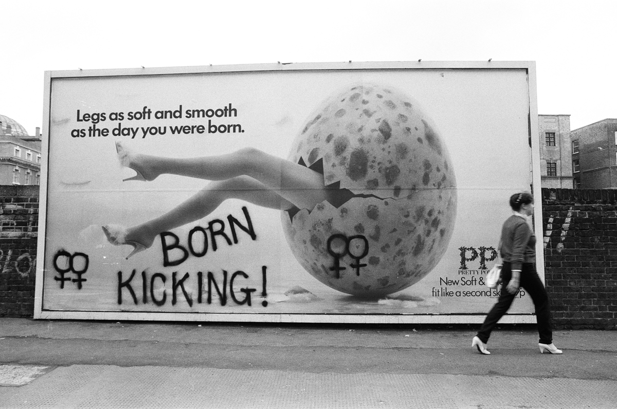 The repudiation is seen, for example, in Jill Posener’s beautiful punk gesture, where she and collaborators from a lesbian squat she lived in spray-painted over misogynist ads in London streets. On a campaign showing a pair of high-heeled legs breaking out of an egg, the copy reading “Legs as soft and smooth as the day you were born,” they scrawled “BORN KICKING!” (1983). They photographed these actions and sold the prints as postcards to raise money for radical causes. Six framed photographs of these marvelously angry public interventions are included here; the postcards are not, though they would have been at home in this exhibition, which displays hundreds of pieces of ephemera and archival items, such as photos, postcards, posters, zines, and little button badges that read things like “YBA WIFE” and “Don’t do it, Di.”
