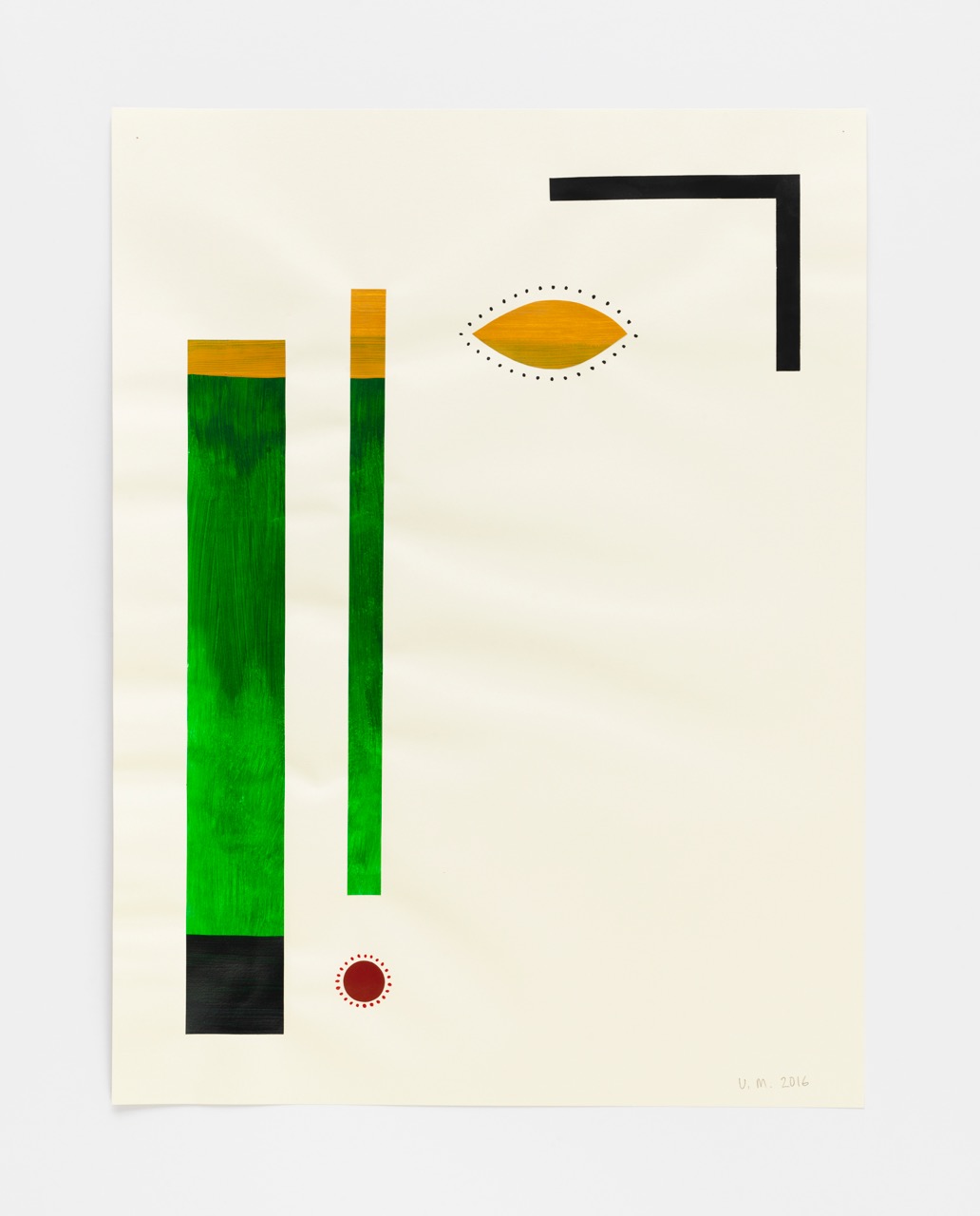 In Brat (2016), the hyper, eight-legged or -petaled shape moves just like a “brat,” with a mind of its own, not tethered to the polite corners, one marked in blue and one in dark red. Other works in acrylic and papier collé on paper, like Façade and The Smoker (both 2016), are faces and architecture. They remind us of the stylized, metonymic manner in which a face could be signaled in abstraction’s early days, or a right angle made more impressive, more meaningful, in a building. And, like those early, communally oriented avant-gardes, they too tread that line between the modular and the ornamented, the systematic and the individual.